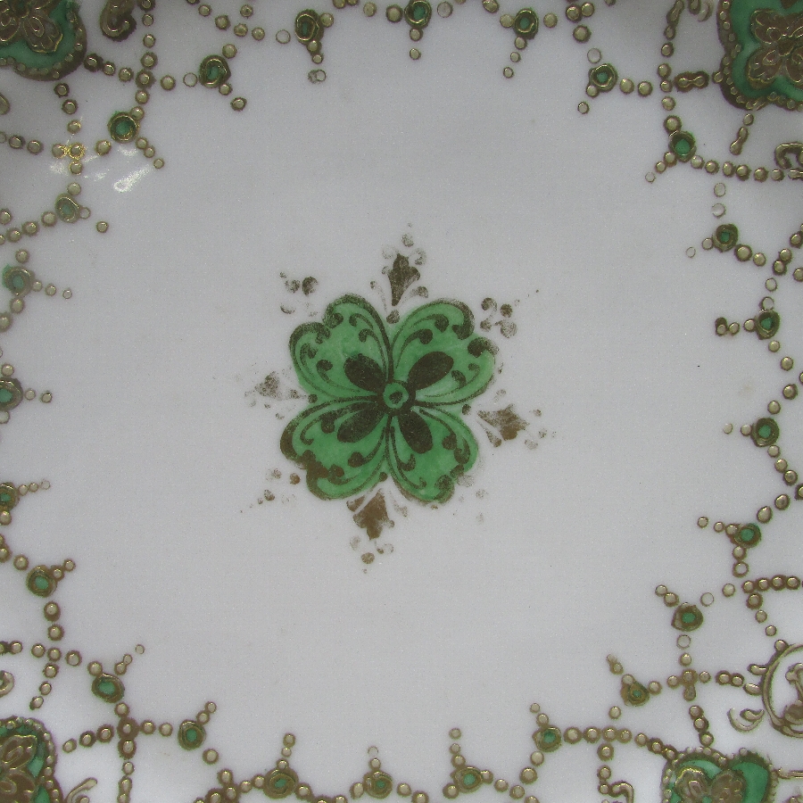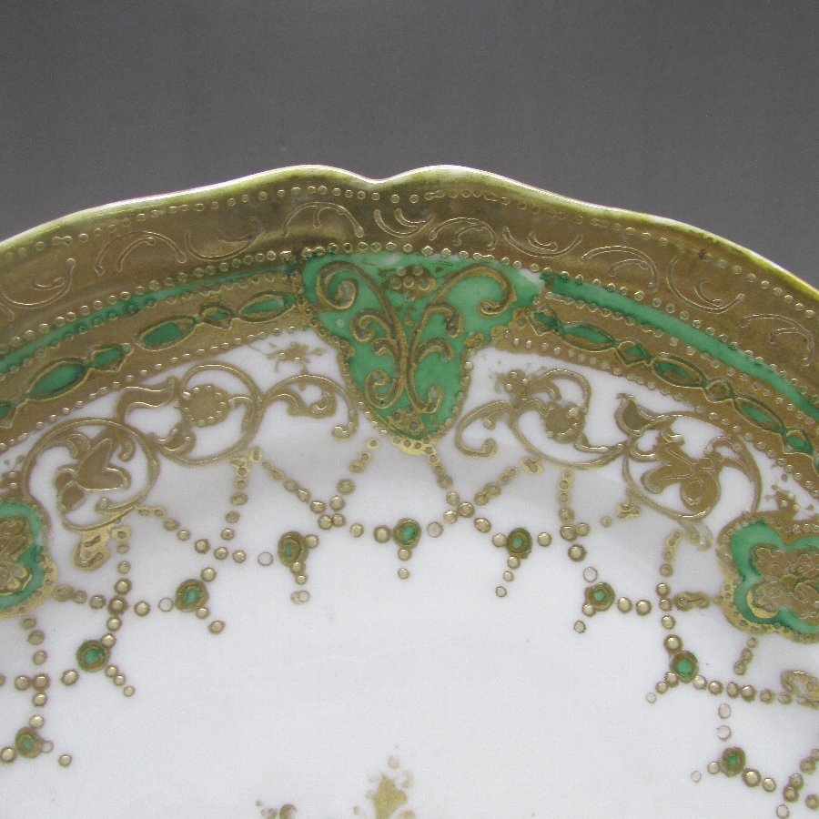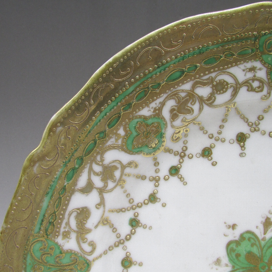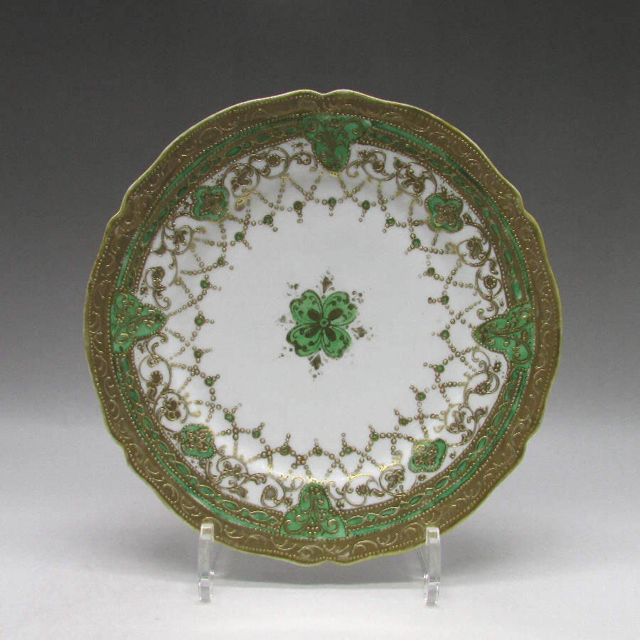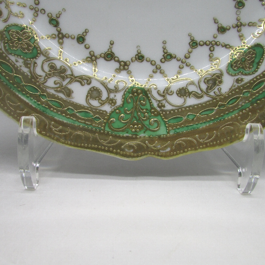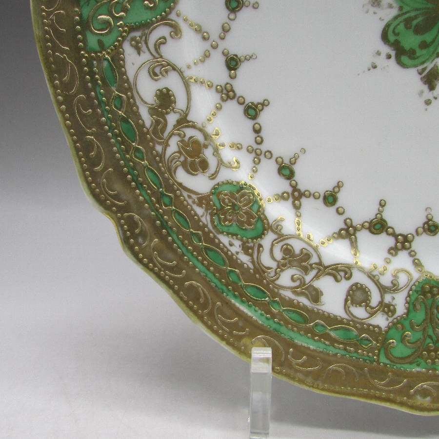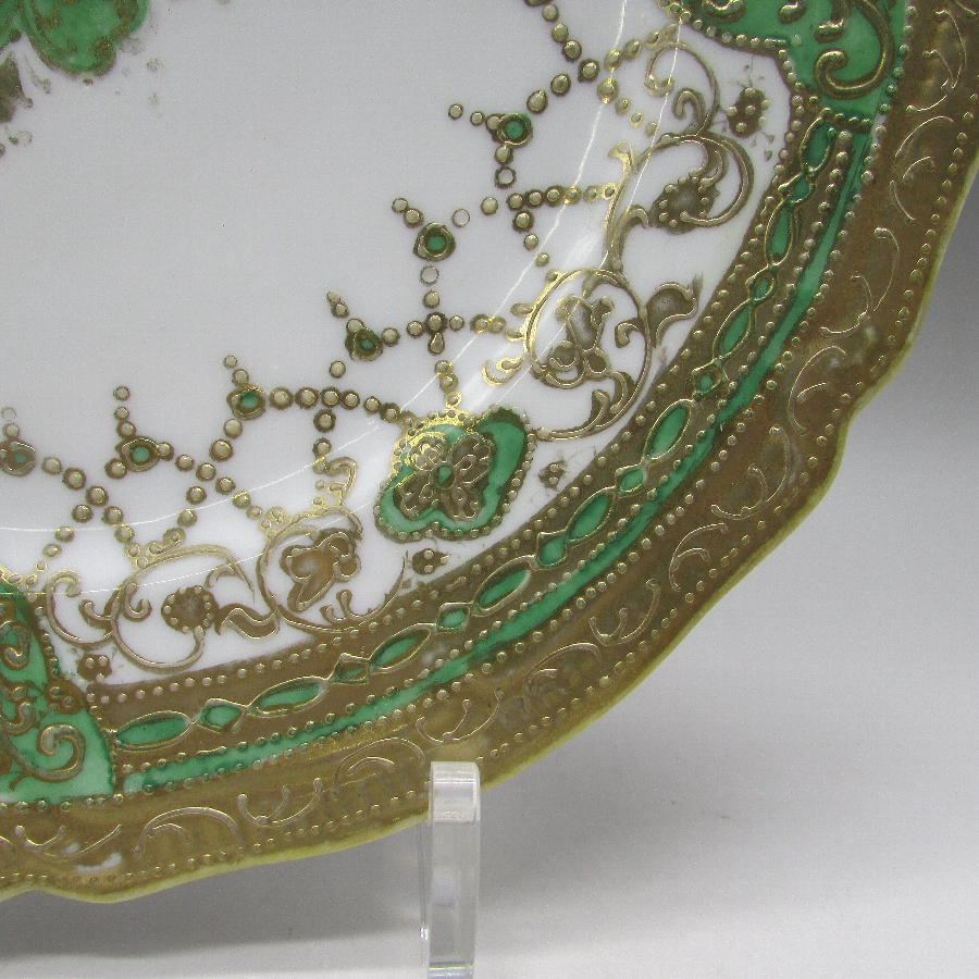 オールドノリタケの緑地金点盛りネックレス紋様プレートです。1891年頃~1915年頃にアメリカに輸出され、約100年の時を経て日本に里帰りしてきました。金点盛り装飾を用いた豪華絢爛な素敵な作品です。金点盛り(ビーディング)は盛り上げ技法の一種で、細かく点状に盛り上げて金彩を筆で装飾したものです。丹念な職人技で花瓶や皿などの高級品によく用いられた装飾技法です。現在の技術や採算の面からも再現は不可能といっても過言ではない程の技術です。