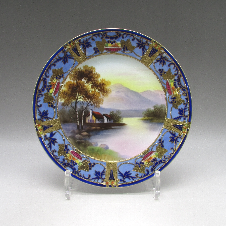 オールドノリタケの金彩夕焼風景文プレートです。1911年頃~1941年頃にイギリスに輸出され、約100年の時を経て日本に里帰りしてきました。オールドノリタケは現在のノリタケカンパニーが明治末期から戦前までに製造したアンティーク陶磁器の総称です。豪華絢爛な西洋風絵付け陶磁器は海外で人気を博しました。近年では、約100年という長い歳月を経て日本に里帰りしてきたことで、わが国でも大変人気が高くなっており、美術工芸品として高い地位を確保しつつあります。
