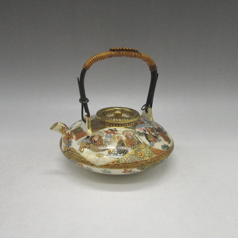 薩摩焼(銘:金光山)が海外向けに作陶した色絵金襴手人物文水注です。薩摩焼は明治時代に欧米で「極東の宝石」と評され、日本の陶磁器の人気に火を付けました。陶磁器を有望な輸出品として認識した政府は、様々な政策を講じて輸出の後押しをした結果、日本各地で作陶され様々な発展を遂げていきました。