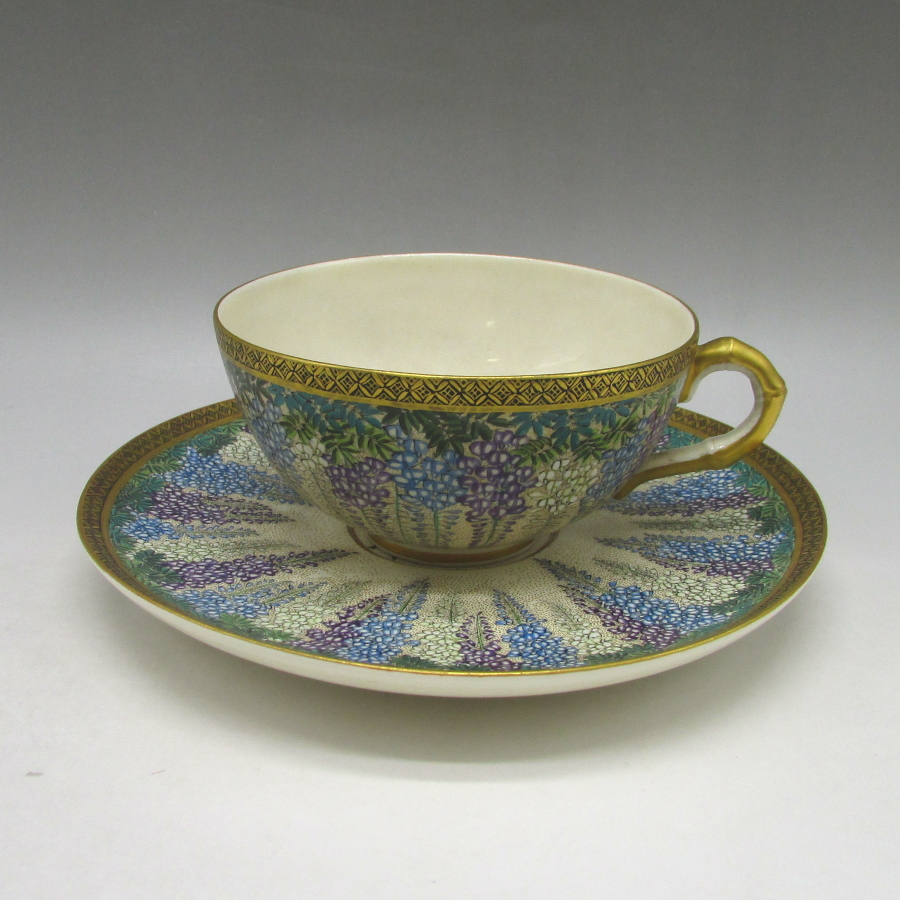 薩摩焼(銘:錦光山)が海外向けに作陶した下藤蝶文茶碗です。薩摩焼は明治時代に欧米で「極東の宝石」と評され、日本の陶磁器の人気に火を付けました。陶磁器を有望な輸出品として認識した政府は、様々な政策を講じて輸出の後押しをした結果、日本各地で作陶され様々な発展を遂げていきました。