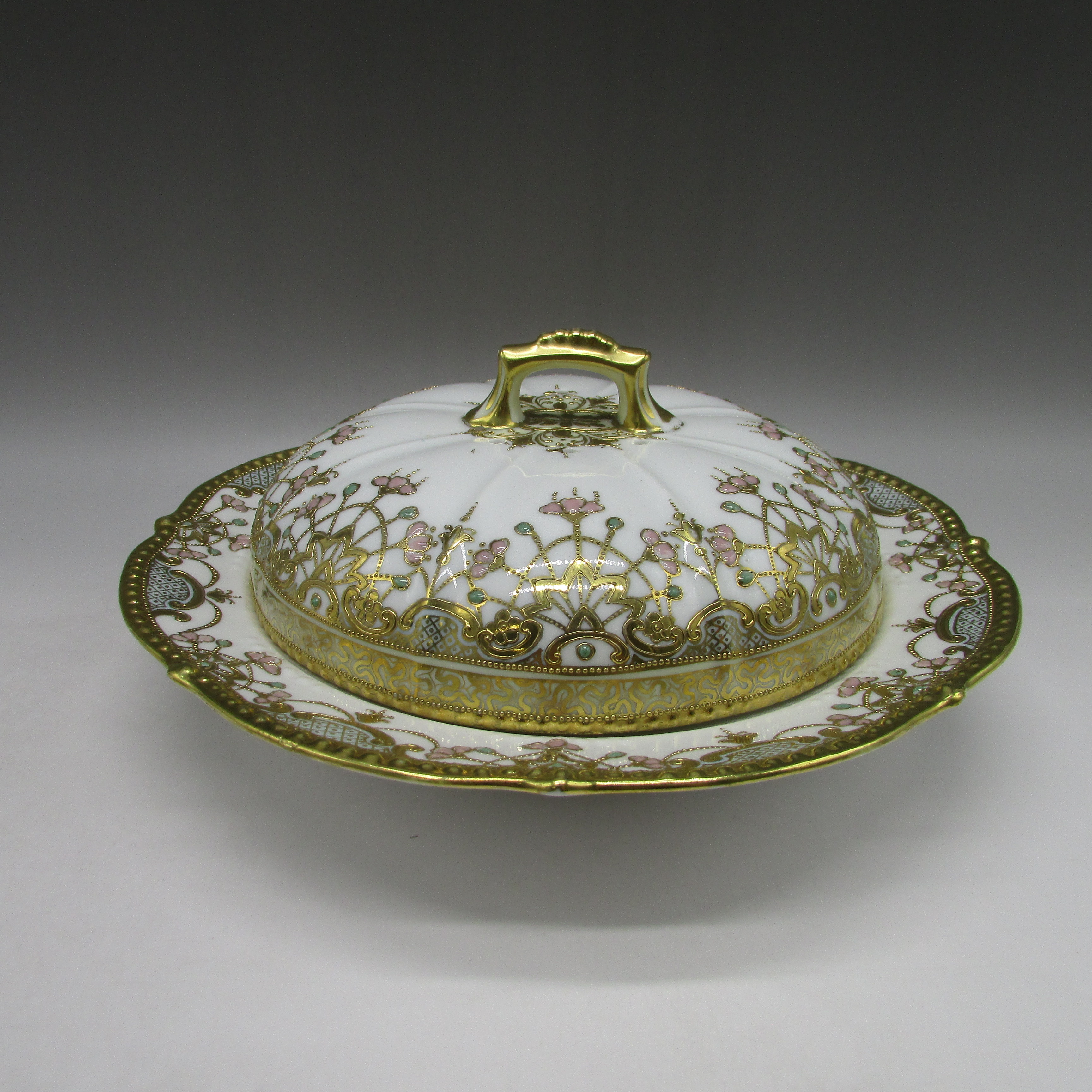 オールドノリタケの金盛りジュールパンケーキサーバーです。1891年頃~1915年頃にアメリカに輸出され、約100年の時を経て日本に里帰りしてきました。オールドノリタケは現在のノリタケカンパニーが明治末期から戦前までに製造したアンティーク陶磁器の総称です。豪華絢爛な西洋風絵付け陶磁器は海外で人気を博しました。近年では、約100年という長い歳月を経て日本に里帰りしてきたことで、わが国でも大変人気が高くなっており、美術工芸品として高い地位を確保しつつあります。