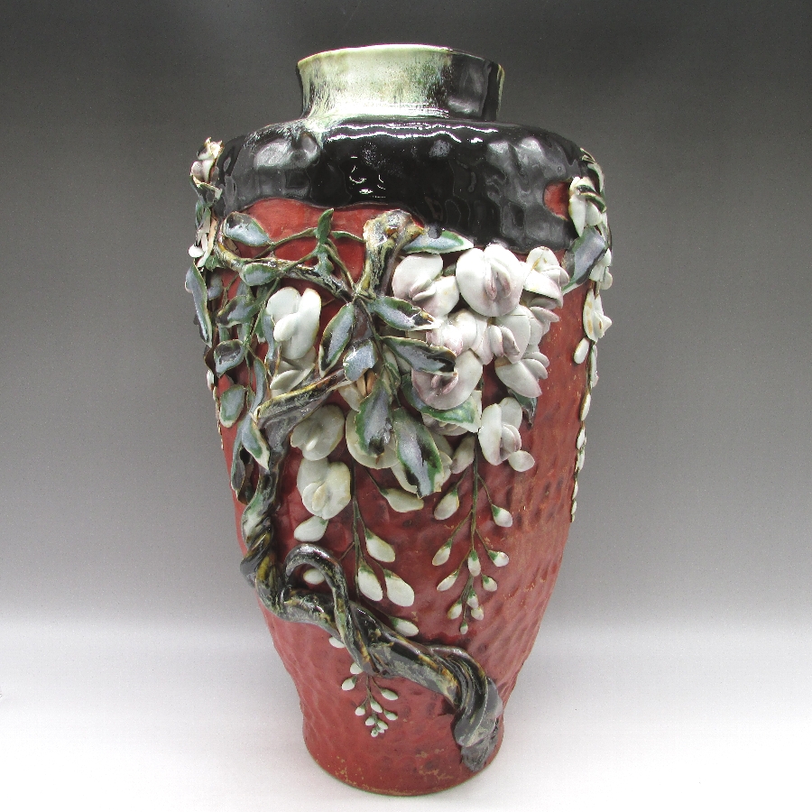 隅田焼は愛知県瀬戸市に生まれた井上良斎が1875年に島田惣兵衛の協力で、隅田川近くの浅草橋場町に窯を築いた事から始まりました。陶磁器に生き物や植物等を貼り付ける高浮彫の技法で装飾され、上部に薬を掛け流した生命力溢れる作品は、今までの日本の陶磁器にはなかった自由奔放さが表現されており、江戸の文化を漂わせています。輸出工芸として横浜港から欧米諸国に輸出された隅田焼は、欧米人を魅了しました。特に米国商社のヴァンタイン商会が長年に渡って取り扱いました。