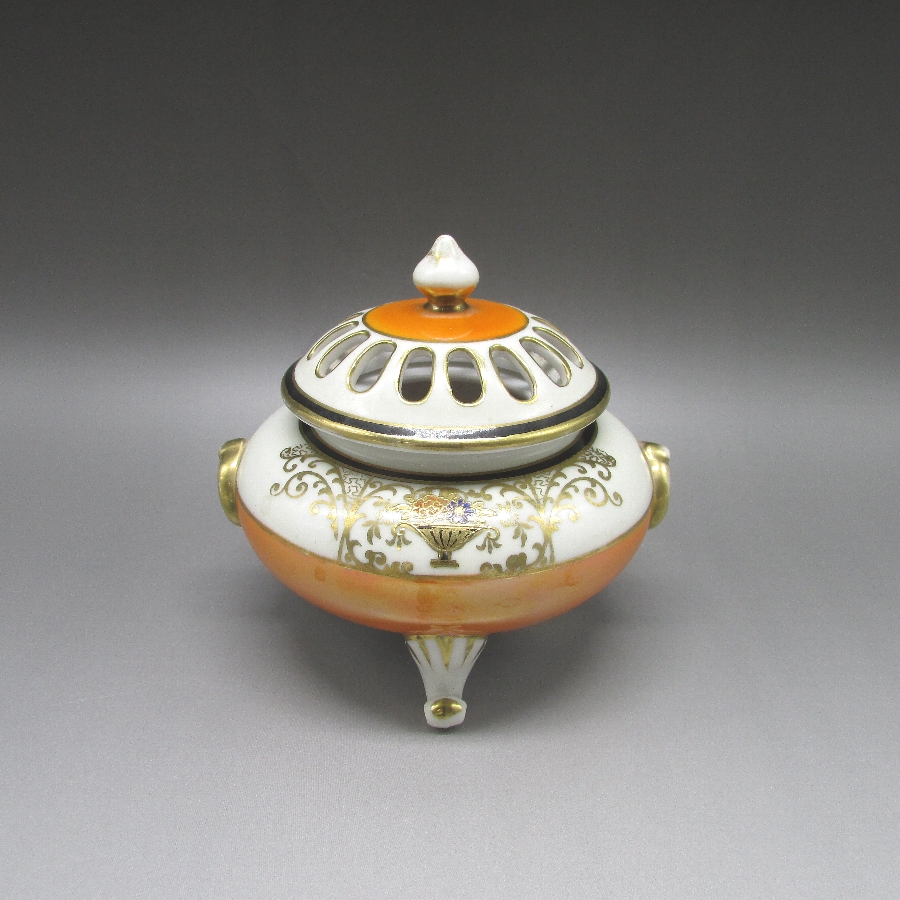 オールドノリタケの金盛り唐草文ポプリポットです。1911年頃~1941年頃にイギリスに輸出され、約100年の時を経て日本に里帰りしてきました。オールドノリタケは現在のノリタケカンパニーが明治末期から戦前までに製造したアンティーク陶磁器の総称です。豪華絢爛な西洋風絵付け陶磁器は海外で人気を博しました。近年では、約100年という長い歳月を経て日本に里帰りしてきたことで、わが国でも大変人気が高くなっており、美術工芸品として高い地位を確保しつつあります。