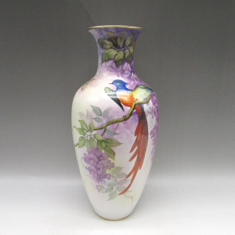 オールドノリタケのアールデコ鳥文大花瓶です。1921年頃~1941年頃にアメリカに輸出され、約100年の時を経て日本に里帰りしてきました。オールドノリタケは現在のノリタケカンパニーが明治末期から戦前までに製造したアンティーク陶磁器の総称です。豪華絢爛な西洋風絵付け陶磁器は海外で人気を博しました。近年では、約100年という長い歳月を経て日本に里帰りしてきたことで、わが国でも大変人気が高くなっており、美術工芸品として高い地位を確保しつつあります。