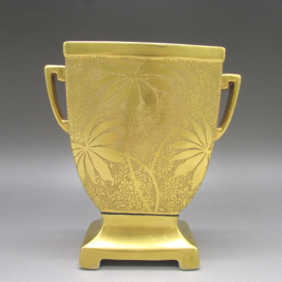 オールドノリタケのエッチング草花文花瓶です。1931年頃~にアメリカに輸出され、約100年の時を経て日本に里帰りしてきました。オールドノリタケは現在のノリタケカンパニーが明治末期から戦前までに製造したアンティーク陶磁器の総称です。豪華絢爛な西洋風絵付け陶磁器は海外で人気を博しました。近年では、約100年という長い歳月を経て日本に里帰りしてきたことで、わが国でも大変人気が高くなっており、美術工芸品として高い地位を確保しつつあります。