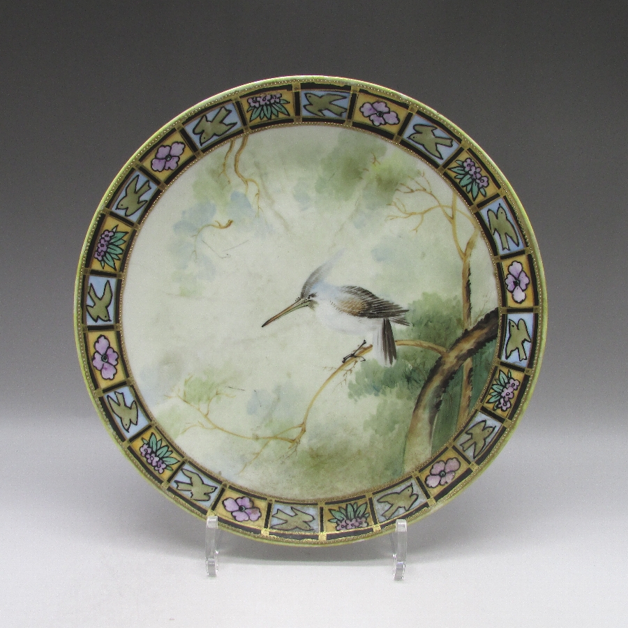 オールドノリタケの翡翠文飾皿です。1891年頃~1915年頃にアメリカに輸出され、約100年の時を経て日本に里帰りしてきました。オールドノリタケは現在のノリタケカンパニーが明治末期から戦前までに製造したアンティーク陶磁器の総称です。豪華絢爛な西洋風絵付け陶磁器は海外で人気を博しました。近年では、約100年という長い歳月を経て日本に里帰りしてきたことで、わが国でも大変人気が高くなっており、美術工芸品として高い地位を確保しつつあります。