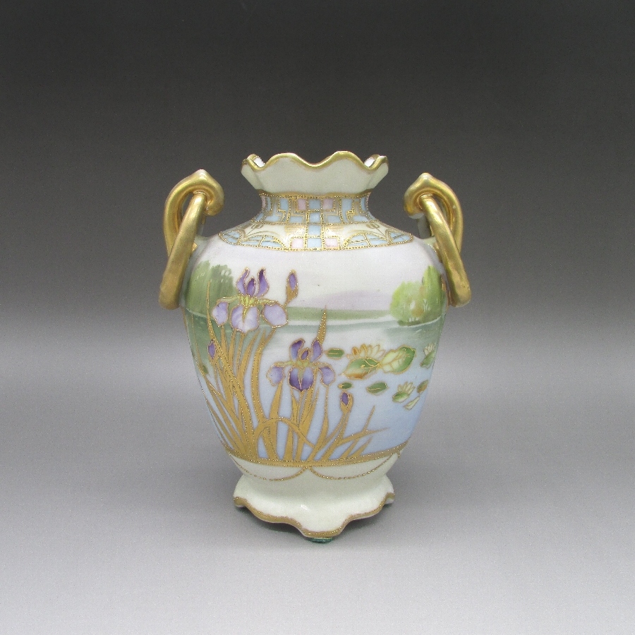 オールドノリタケの金盛り風景文花瓶です。1911年頃~1921年頃にアメリカに輸出され、約100年の時を経て日本に里帰りしてきました。オールドノリタケは現在のノリタケカンパニーが明治末期から戦前までに製造したアンティーク陶磁器の総称です。豪華絢爛な西洋風絵付け陶磁器は海外で人気を博しました。近年では、約100年という長い歳月を経て日本に里帰りしてきたことで、わが国でも大変人気が高くなっており、美術工芸品として高い地位を確保しつつあります。