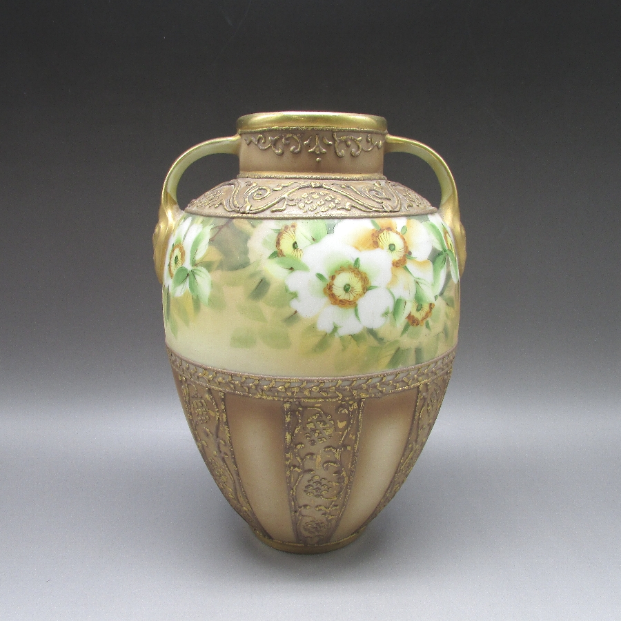 オールドノリタケの盛り上げ花文花瓶です。1911年頃~1921年頃にアメリカに輸出され、約100年の時を経て日本に里帰りしてきました。