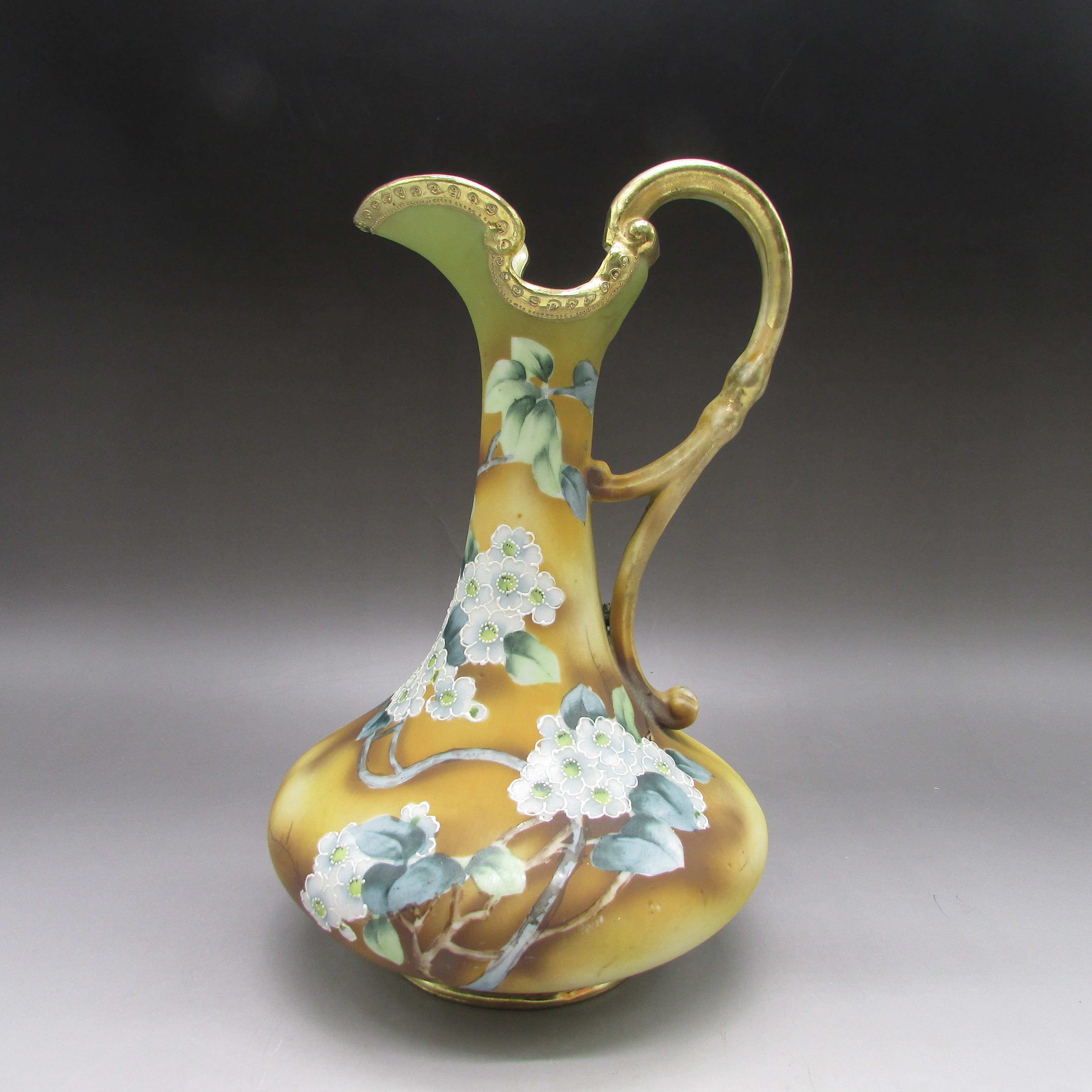 オールドノリタケの白花盛り上げ水差です。1891年頃~1915年頃にアメリカに輸出され、約100年の時を経て日本に里帰りしてきました。オールドノリタケは現在のノリタケカンパニーが明治末期から戦前までに製造したアンティーク陶磁器の総称です。豪華絢爛な西洋風絵付け陶磁器は海外で人気を博しました。近年では、約100年という長い歳月を経て日本に里帰りしてきたことで、わが国でも大変人気が高くなっており、美術工芸品として高い地位を確保しつつあります。