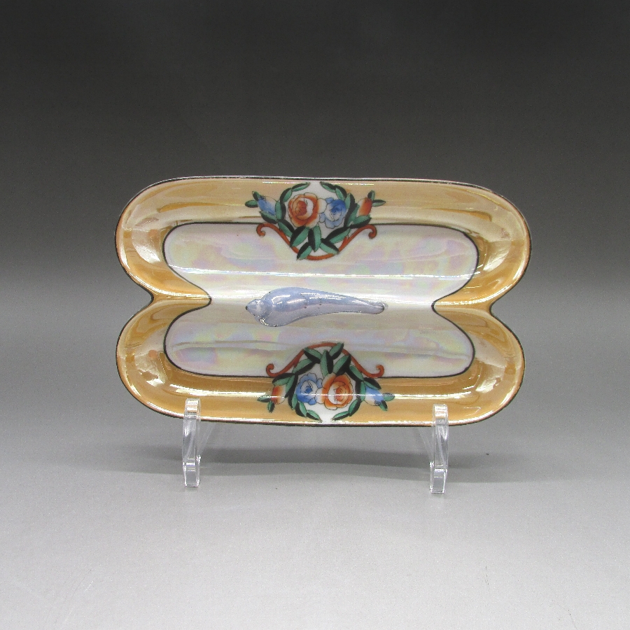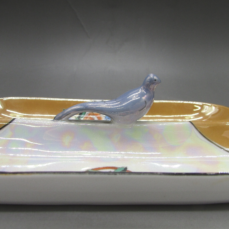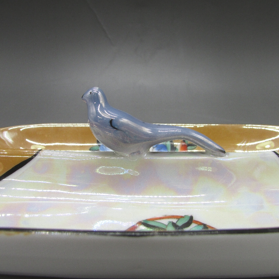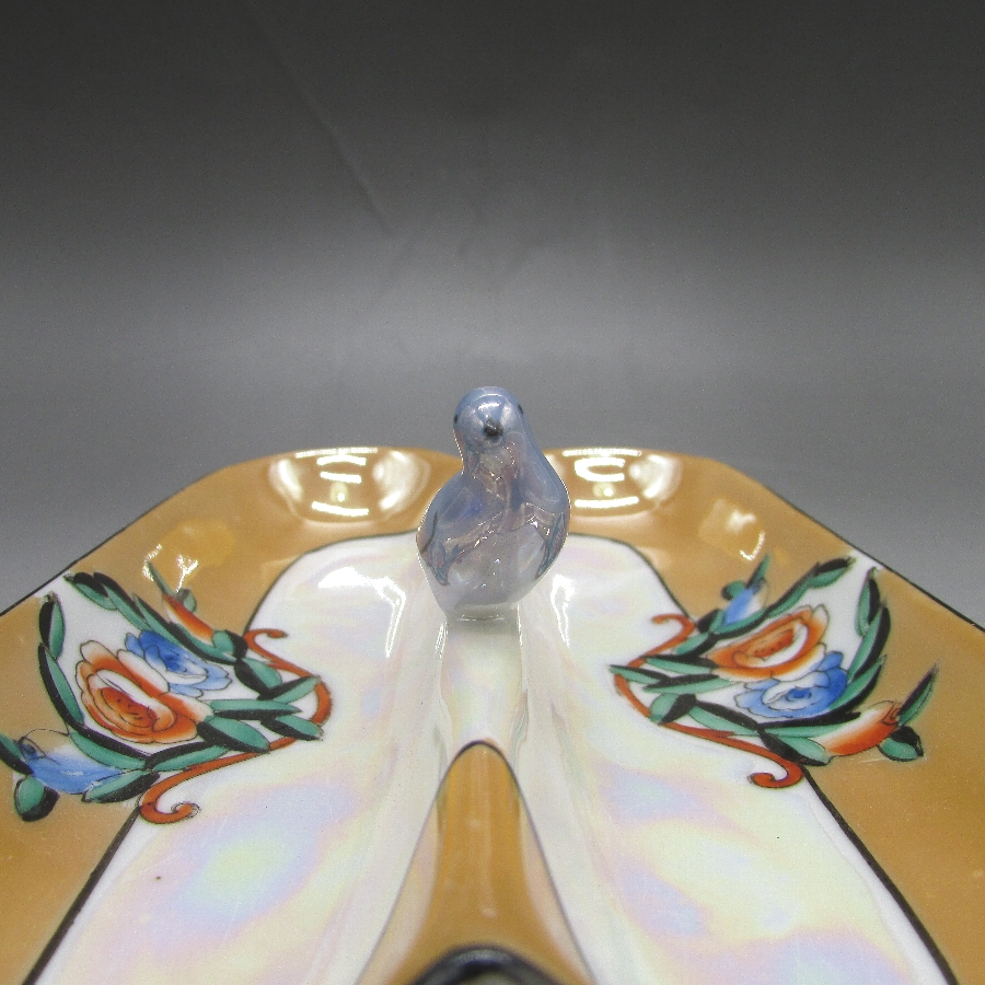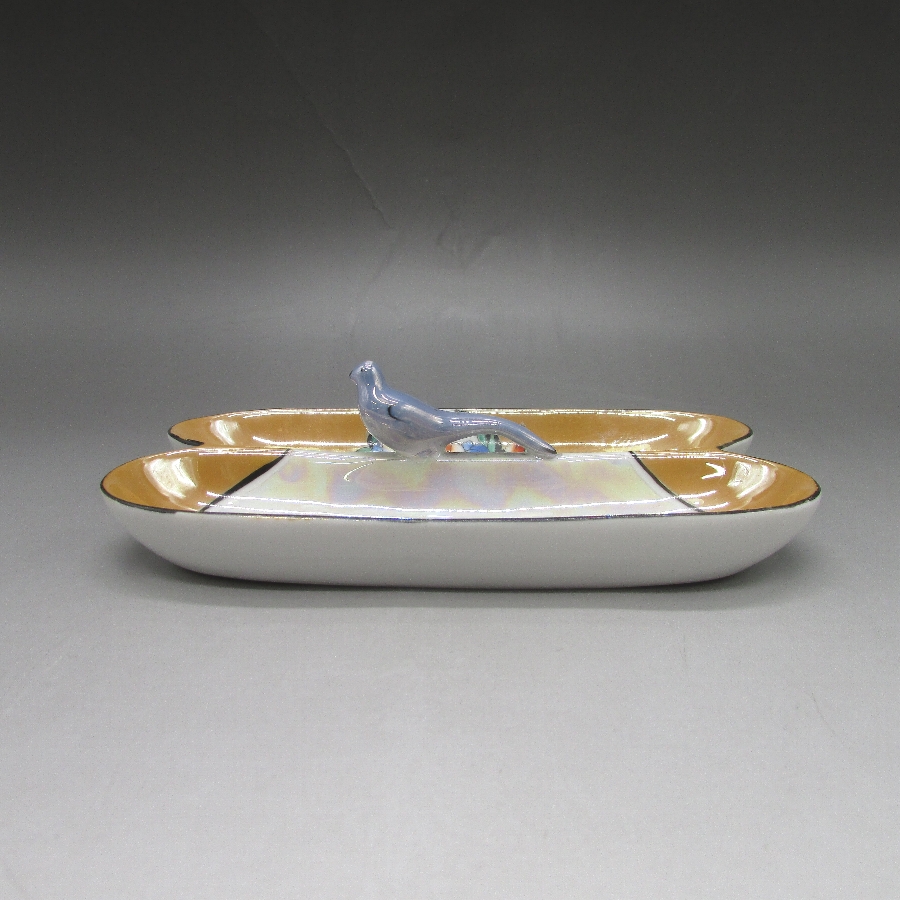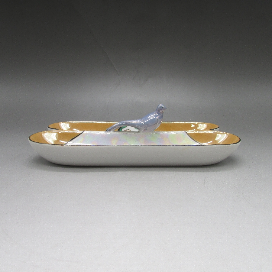 オールドノリタケの鳥フィギュア付ペントレーです。1921年頃~1941年頃にアメリカに輸出され、約100年の時を経て日本に里帰りしてきました。フィギュア付きのアイテムはオールドノリタケのコレクターの間でとても人気があります。その中でも特に人気の高いものが鳥のフィギュアが付いたもので、「フィギュラルバード(FIGURAL