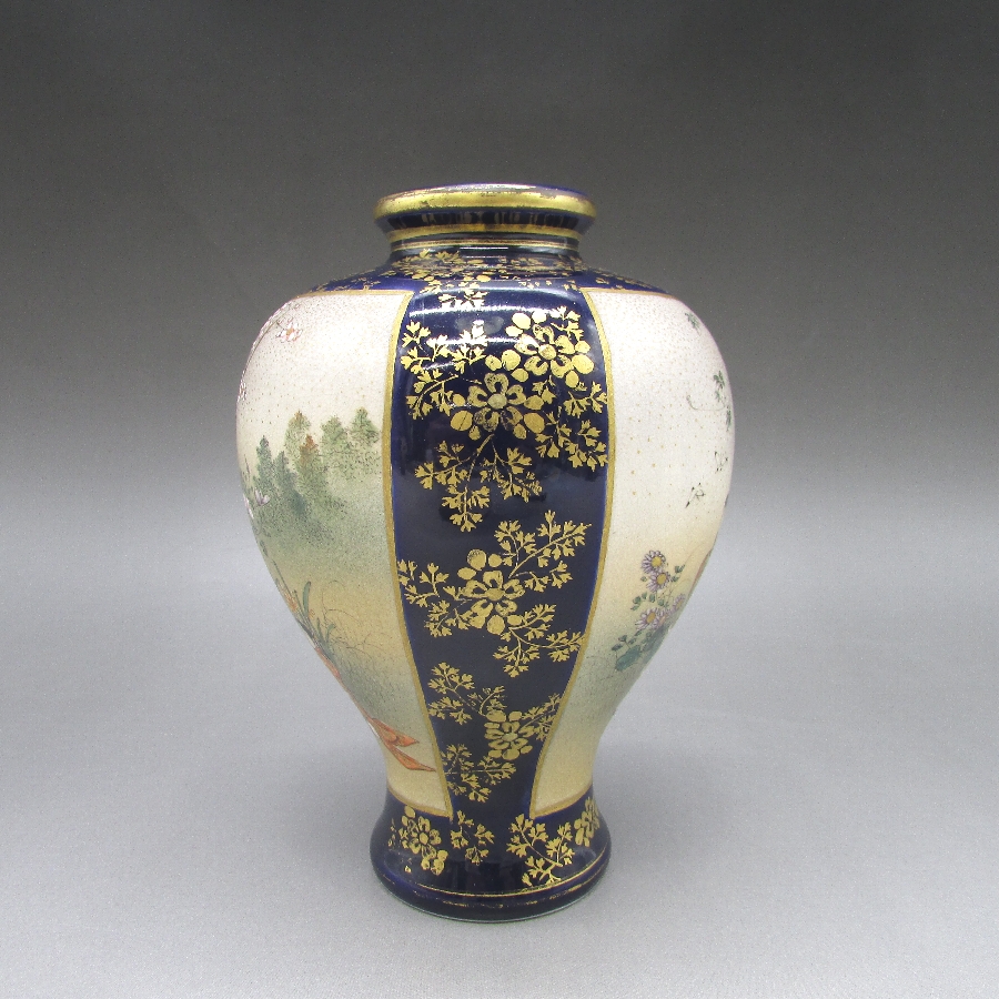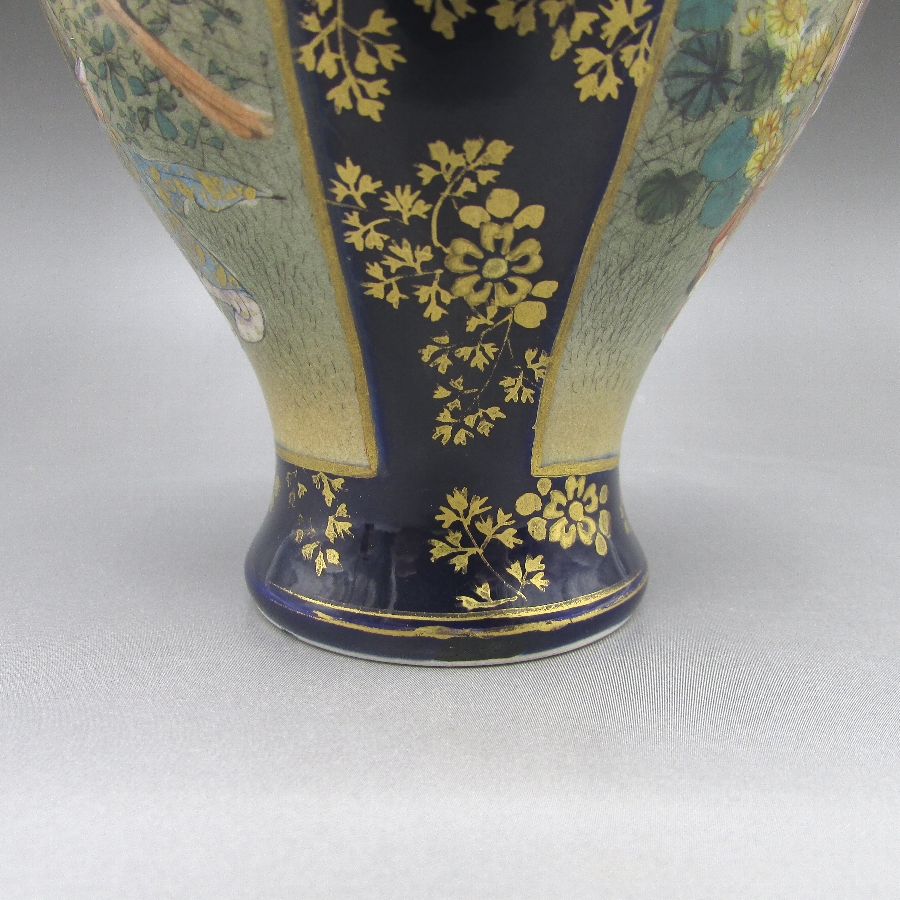 薩摩焼・錦山が海外向けに作陶した瑠璃地金襴手芸者文花瓶一対です。薩摩焼は明治時代に欧米で「極東の宝石」と評され、日本の陶磁器の人気に火を付けました。陶磁器を有望な輸出品として認識した政府は、様々な政策を講じて輸出の後押しをした結果、日本各地で作陶され様々な発展を遂げていきました。