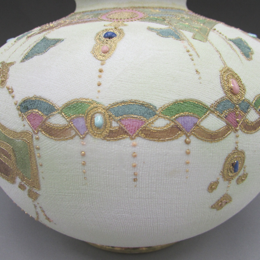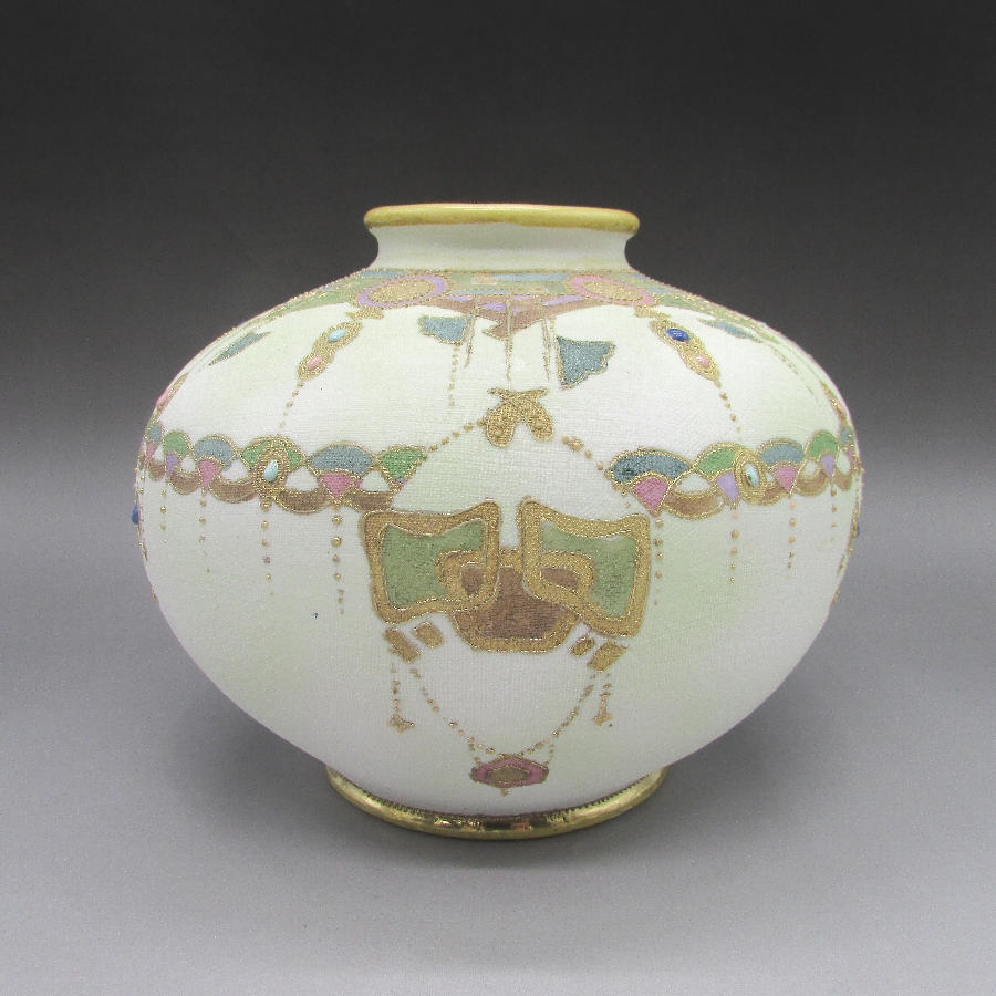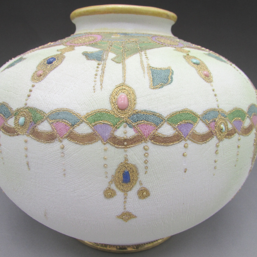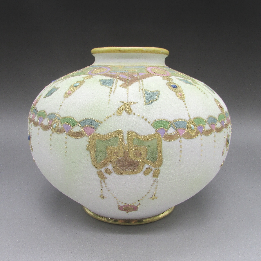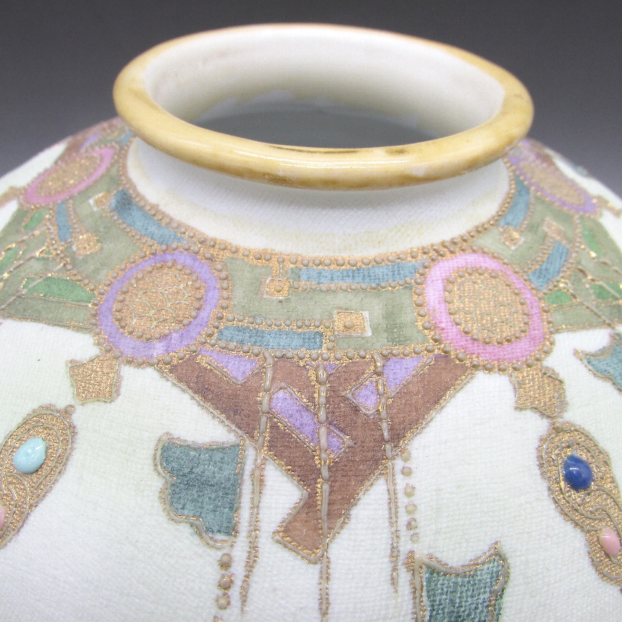 オールドノリタケのタペストリー宝石文花瓶です。1891年頃~1915年頃にアメリカに輸出され、約100年の時を経て日本に里帰りしてきました。オールドノリタケは現在のノリタケカンパニーが明治末期から戦前までに製造したアンティーク陶磁器の総称です。豪華絢爛な西洋風絵付け陶磁器は海外で人気を博しました。近年では、約100年という長い歳月を経て日本に里帰りしてきたことで、わが国でも大変人気が高くなっており、美術工芸品として高い地位を確保しつつあります。