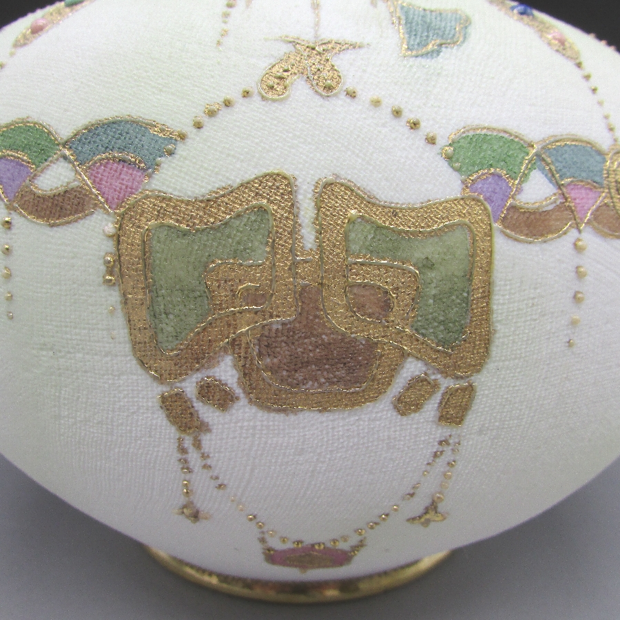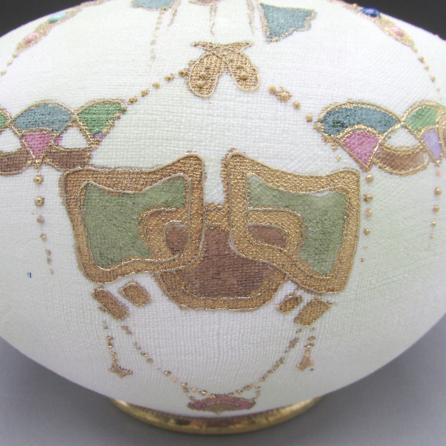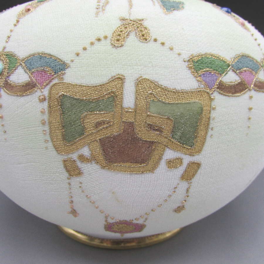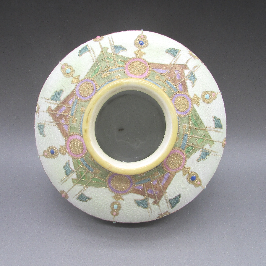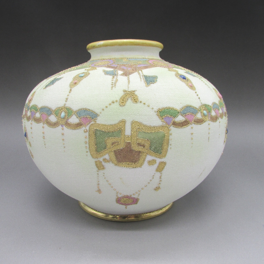 オールドノリタケのタペストリー宝石文花瓶です。1891年頃~1915年頃にアメリカに輸出され、約100年の時を経て日本に里帰りしてきました。オールドノリタケは現在のノリタケカンパニーが明治末期から戦前までに製造したアンティーク陶磁器の総称です。豪華絢爛な西洋風絵付け陶磁器は海外で人気を博しました。近年では、約100年という長い歳月を経て日本に里帰りしてきたことで、わが国でも大変人気が高くなっており、美術工芸品として高い地位を確保しつつあります。