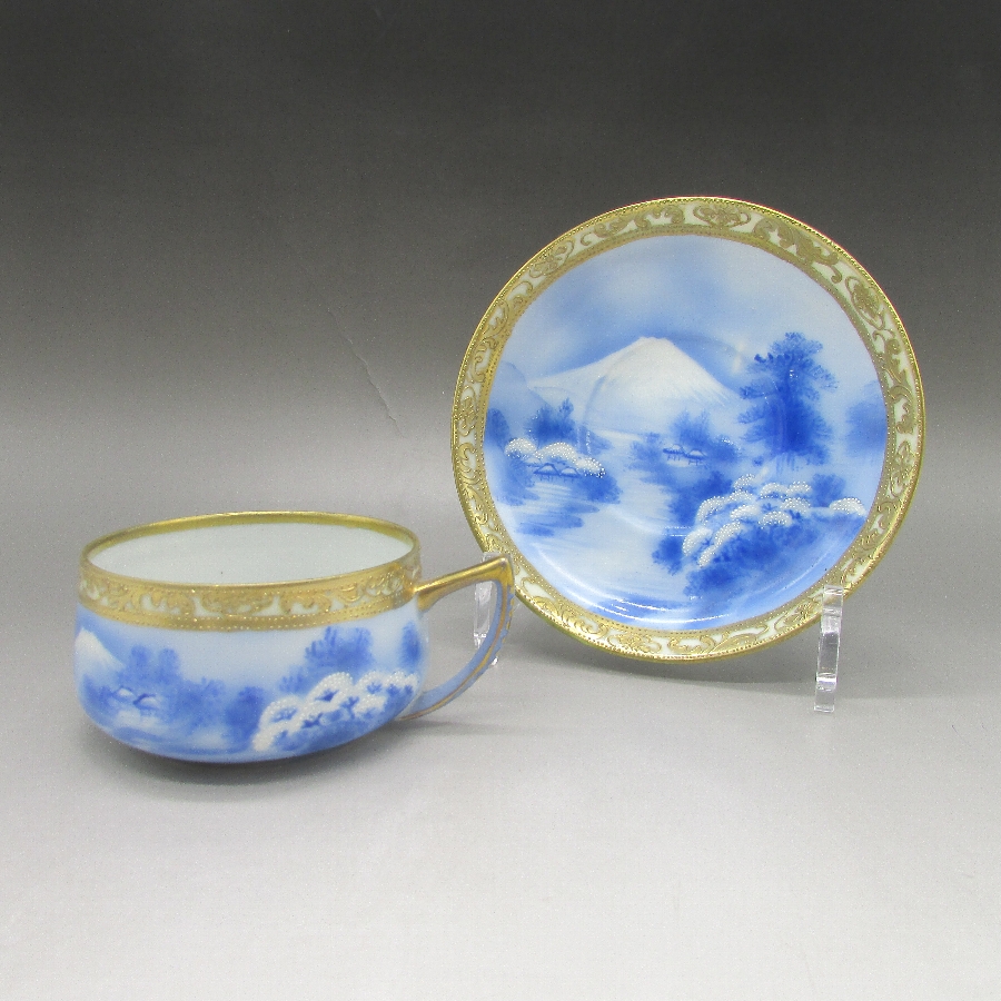 オールド・ジャパンが海外向けに作陶した富士湖畔風景文カップ&ソーサーです。オールド・ジャパンとは森村組や日本陶器が大正・昭和時代に主に欧米諸国に輸出していた時期と同時期に海を渡った日本製の陶磁器の総称です。資料が非常に