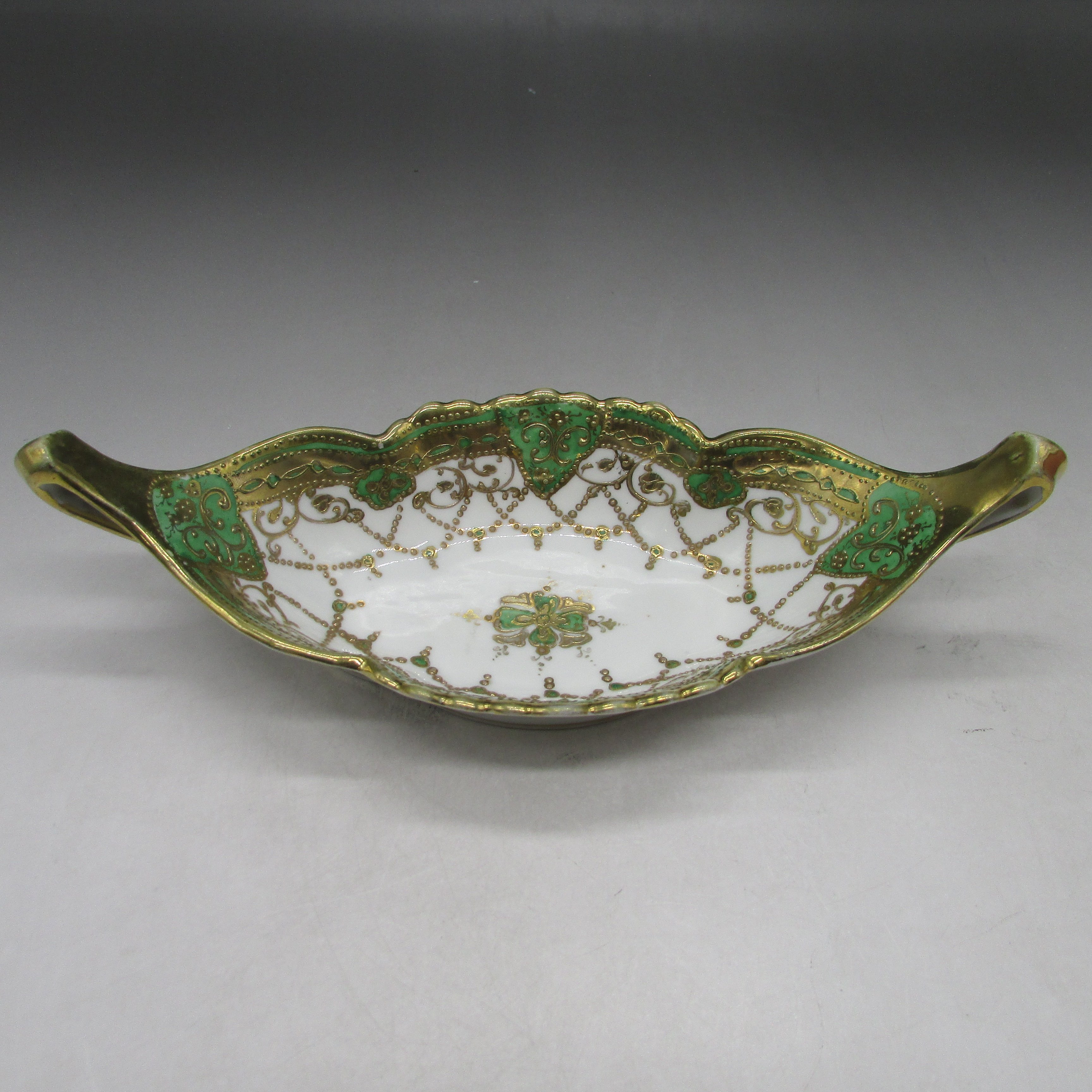オールドノリタケの金盛りネックレス文ボウルです。1891年頃~1915年頃にアメリカに輸出され、約100年の時を経て日本に里帰りしてきました。オールドノリタケは現在のノリタケカンパニーが明治末期から戦前までに製造したアンティーク陶磁器の総称です。豪華絢爛な西洋風絵付け陶磁器は海外で人気を博しました。近年では、約100年という長い歳月を経て日本に里帰りしてきたことで、わが国でも大変人気が高くなっており、美術工芸品として高い地位を確保しつつあります。