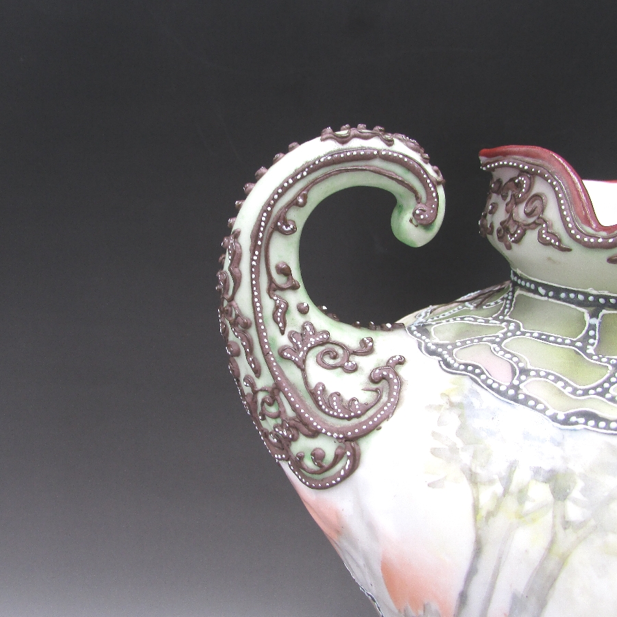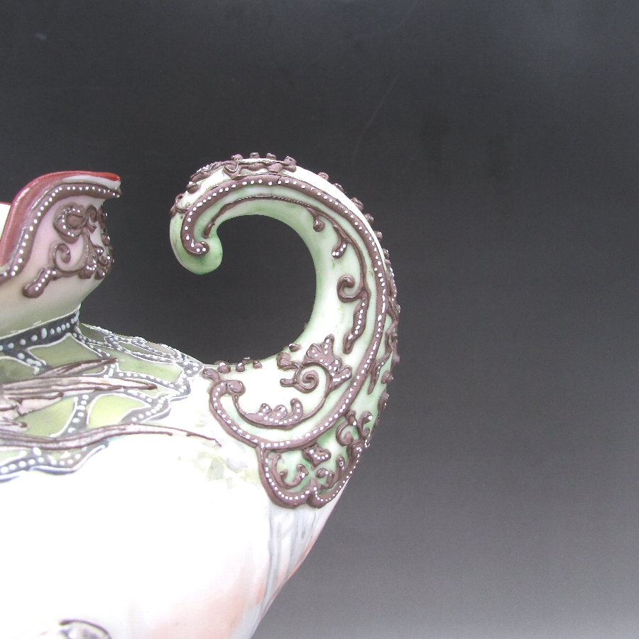 オールドノリタケの盛上燕文筋肉人型花瓶です。1891年頃~1915年頃にアメリカに輸出され、約100年の時を経て日本に里帰りしてきました。オールドノリタケは現在のノリタケカンパニーが明治末期から戦前までに製造したアンティーク陶磁器の総称です。豪華絢爛な西洋風絵付け陶磁器は海外で人気を博しました。近年では、約100年という長い歳月を経て日本に里帰りしてきたことで、わが国でも大変人気が高くなっており、美術工芸品として高い地位を確保しつつあります。