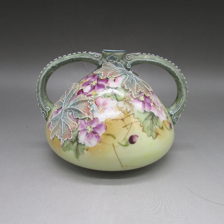 ロイヤルモリエが主に欧米諸国向けに作陶した草花盛り上げ赤紫花文花瓶です。ロイヤルモリエとは森村組や日本陶器(現ノリタケカンパニーリミテッド)が明治・大正時代に主に欧米諸国に輸出していた時期と同時期に海を渡った日本製の陶磁器の総称です。資料が非常に