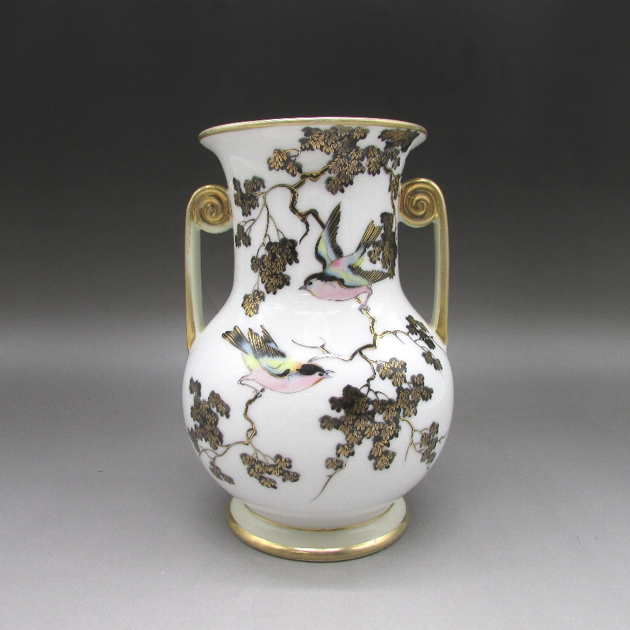 オールドノリタケの金彩鳥文花瓶です。1911年頃~1921年頃にアメリカに輸出され、約100年の時を経て日本に里帰りしてきました。オールドノリタケは現在のノリタケカンパニーが明治末期から戦前までに製造したアンティーク陶磁器の総称です。豪華絢爛な西洋風絵付け陶磁器は海外で人気を博しました。近年では、約100年という長い歳月を経て日本に里帰りしてきたことで、わが国でも大変人気が高くなっており、美術工芸品として高い地位を確保しつつあります。