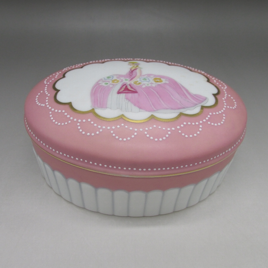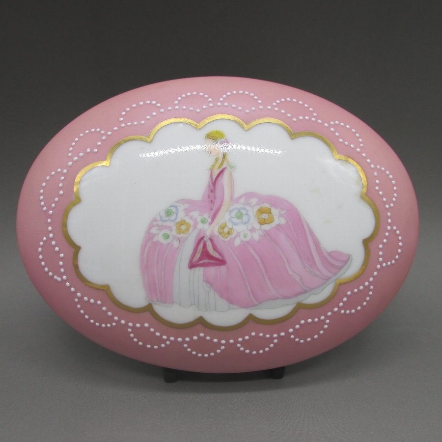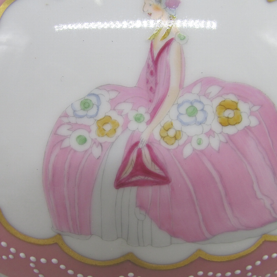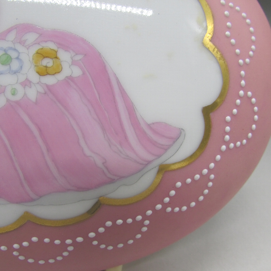 オールドノリタケのデコレディジュエリーボックスです。1921年頃~1941年頃にアメリカに輸出され、約100年の時を経て日本に里帰りしてきました。デコレディはアールデコ期の作品の中でも特に人気の高いシリーズで、「愛らしく、明るい雰囲気」が特徴的です。ホーマー・コナント(1887年-1927年)の「マダム・ポンパドール」の絵を題材に製陶されたものやロシアの「エルテ」などのデザイナーがモティーフになった作品も実在しています。また、それ以外にも「ハーパス・バザール」や「ヴォーグ」といったファッション雑誌に登場する女性を参考にした作品も存在しています。アールデコとは1925年にフランスのパリで開催された現代装飾産業美術国際博覧会によって呼ばれるようになった装飾様式です。東洋美術などの芸術的要素を取り入れた直線と立体のシンプルかつ合理的な機能美あるデザインで、明るく・鮮やかな色彩が特徴的です。ノリタケのアール・デコのデザインは、1919年に英国人デザイナーの「シリル・シー」が入社してから本格的に始まりました。ノリタケ・アール・デコの制作は、1920年頃から1929年の世界恐慌までのわずか10年間程度の制作期間しかなく、未だにその全貌は明らかにされていません。