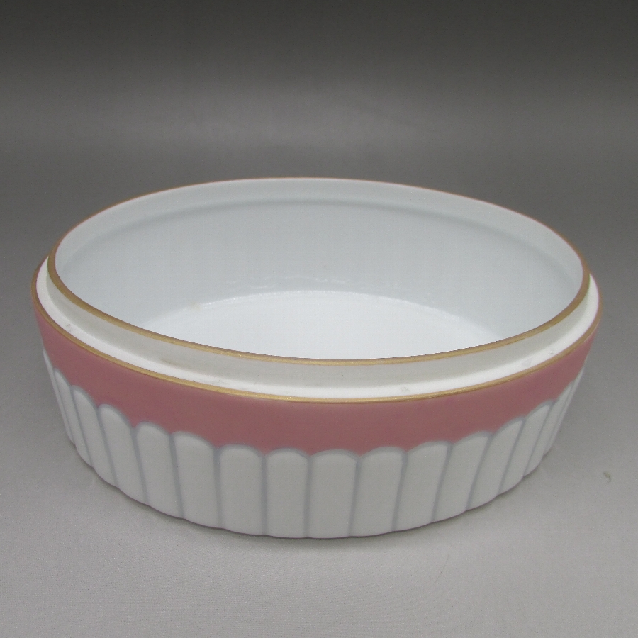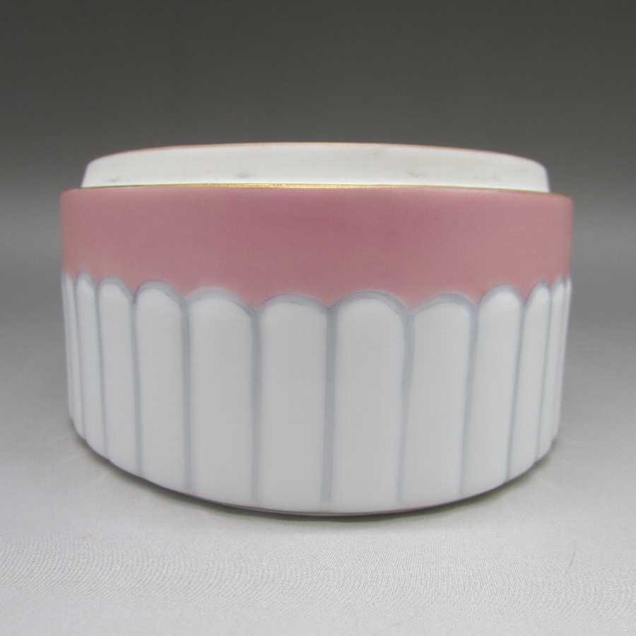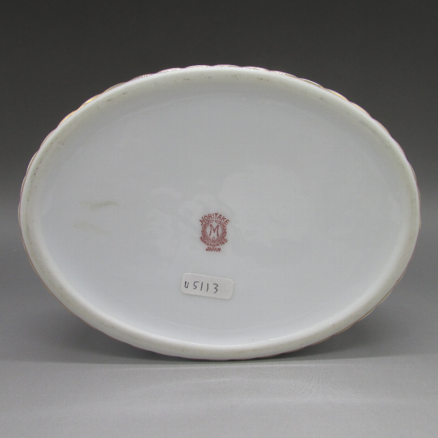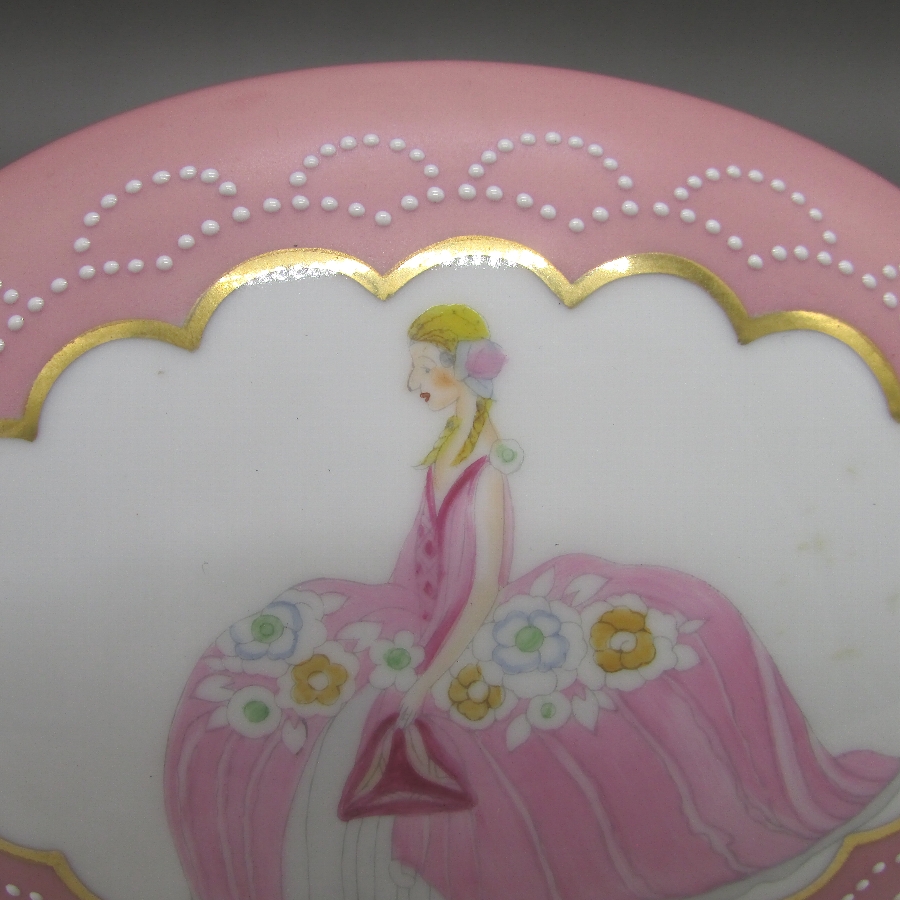 オールドノリタケのデコレディジュエリーボックスです。1921年頃~1941年頃にアメリカに輸出され、約100年の時を経て日本に里帰りしてきました。デコレディはアールデコ期の作品の中でも特に人気の高いシリーズで、「愛らしく、明るい雰囲気」が特徴的です。ホーマー・コナント(1887年-1927年)の「マダム・ポンパドール」の絵を題材に製陶されたものやロシアの「エルテ」などのデザイナーがモティーフになった作品も実在しています。また、それ以外にも「ハーパス・バザール」や「ヴォーグ」といったファッション雑誌に登場する女性を参考にした作品も存在しています。アールデコとは1925年にフランスのパリで開催された現代装飾産業美術国際博覧会によって呼ばれるようになった装飾様式です。東洋美術などの芸術的要素を取り入れた直線と立体のシンプルかつ合理的な機能美あるデザインで、明るく・鮮やかな色彩が特徴的です。ノリタケのアール・デコのデザインは、1919年に英国人デザイナーの「シリル・シー」が入社してから本格的に始まりました。ノリタケ・アール・デコの制作は、1920年頃から1929年の世界恐慌までのわずか10年間程度の制作期間しかなく、未だにその全貌は明らかにされていません。