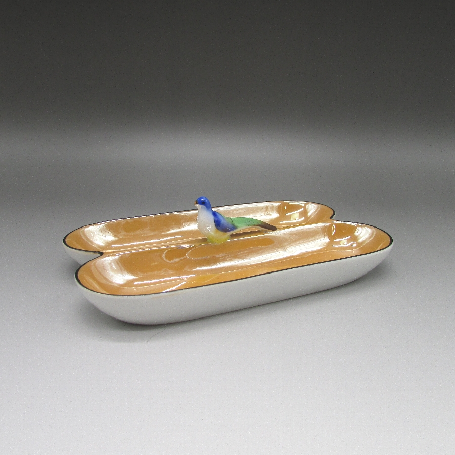 オールドノリタケの鳥フィギュア付ペントレーです。1921年頃~1941年頃にアメリカに輸出され、約100年の時を経て日本に里帰りしてきました。オールドノリタケは現在のノリタケカンパニーが明治末期から戦前までに製造したアンティーク陶磁器の総称です。豪華絢爛な西洋風絵付け陶磁器は海外で人気を博しました。近年では、約100年という長い歳月を経て日本に里帰りしてきたことで、わが国でも大変人気が高くなっており、美術工芸品として高い地位を確保しつつあります。