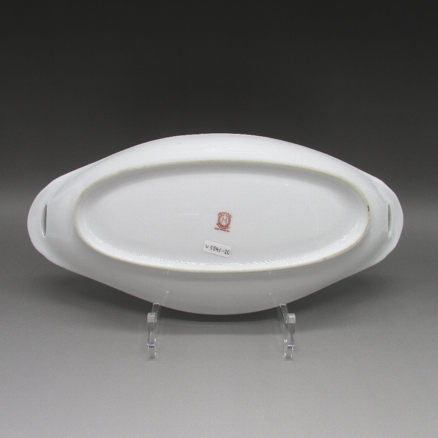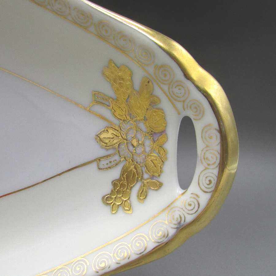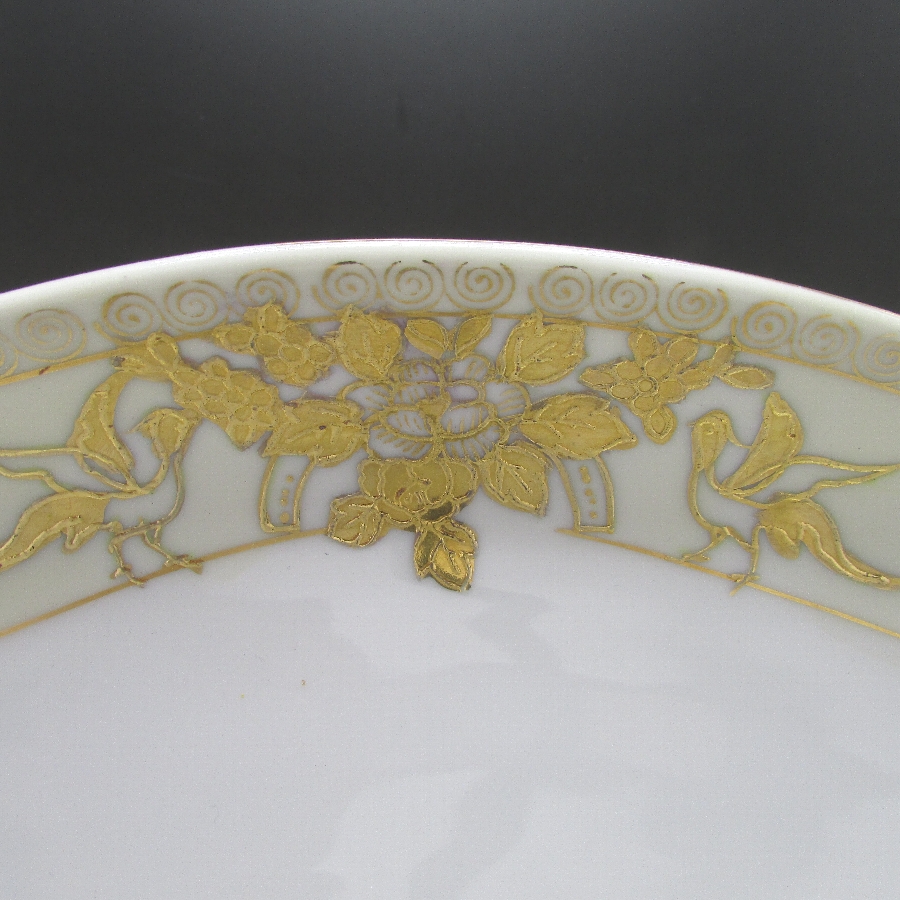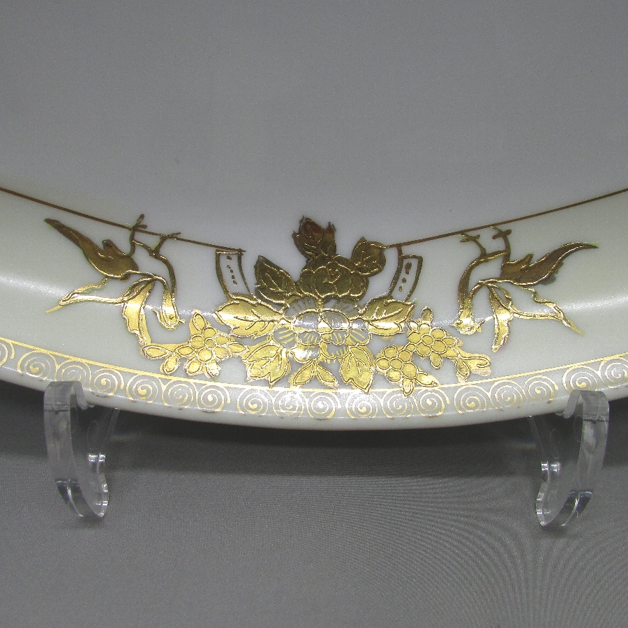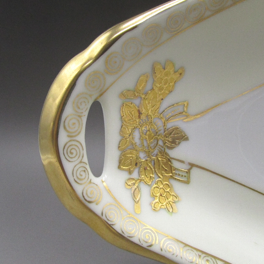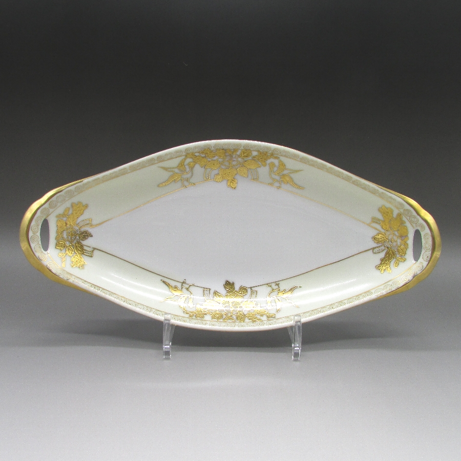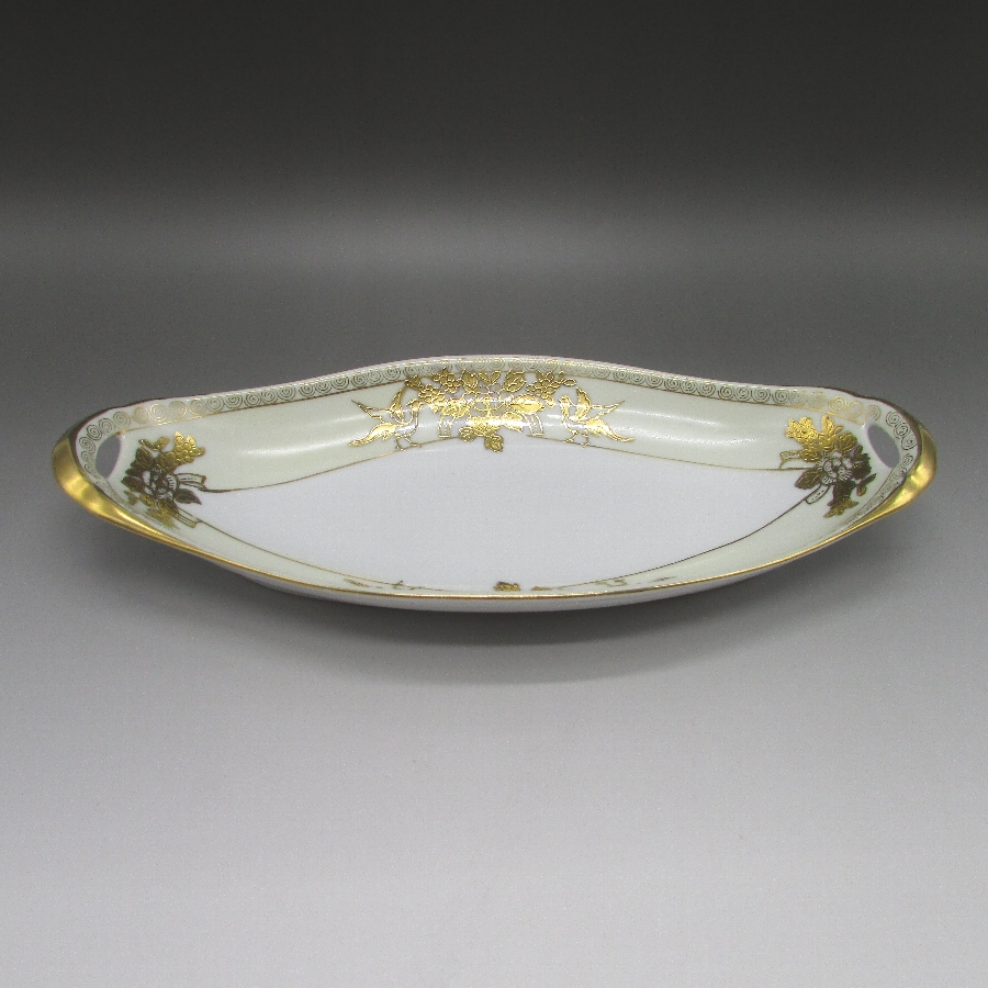 オールドノリタケの金彩セロリ皿です。1921年頃~1941年頃にアメリカに輸出され、約100年の時を経て日本に里帰りしてきました。オールドノリタケは現在のノリタケカンパニーが明治末期から戦前までに製造したアンティーク陶磁器の総称です。豪華絢爛な西洋風絵付け陶磁器は海外で人気を博しました。近年では、約100年という長い歳月を経て日本に里帰りしてきたことで、わが国でも大変人気が高くなっており、美術工芸品として高い地位を確保しつつあります。