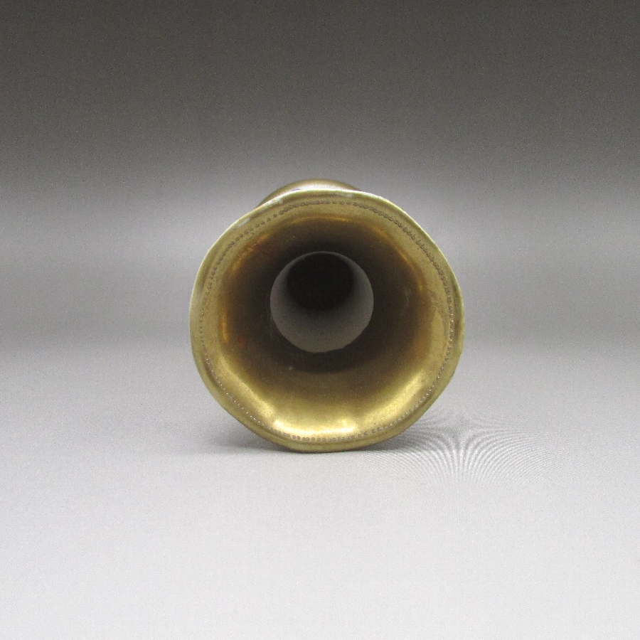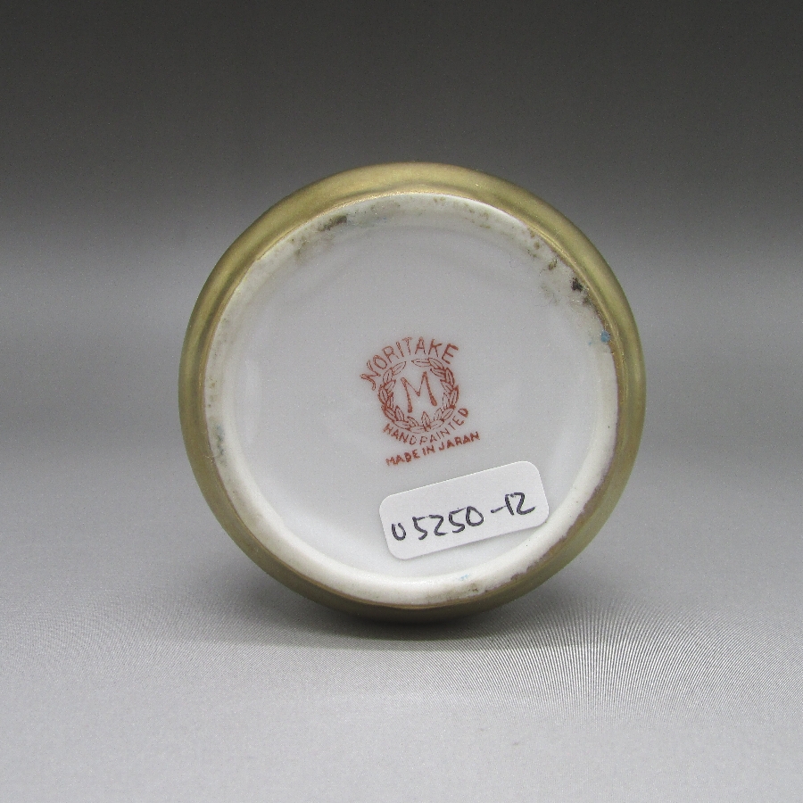 オールドノリタケのゴールド地花文花瓶です。1921年頃~1941年頃にアメリカに輸出され、約100年の時を経て日本に里帰りしてきました。全面ゴールドにしたアールデコ期らしい作風が素敵な作品です。アールデコは1925年にフランスのパリで開催された現代装飾産業美術国際博覧会によって呼ばれるようになった装飾様式です。東洋美術などの芸術的要素を取り入れた直線と立体のシンプルかつ合理的な機能美あるデザインで、明るく・鮮やかな色彩が特徴的です。ノリタケのアール・デコのデザインは1919年に英国人デザイナーの「シリル・シー」が入社してから本格的に始まりました。ノリタケ・アール・デコの制作は1920年頃から1929年の世界恐慌までのわずか10年間程度の制作期間しかなく、未だにその全貌は明らかにされていません。