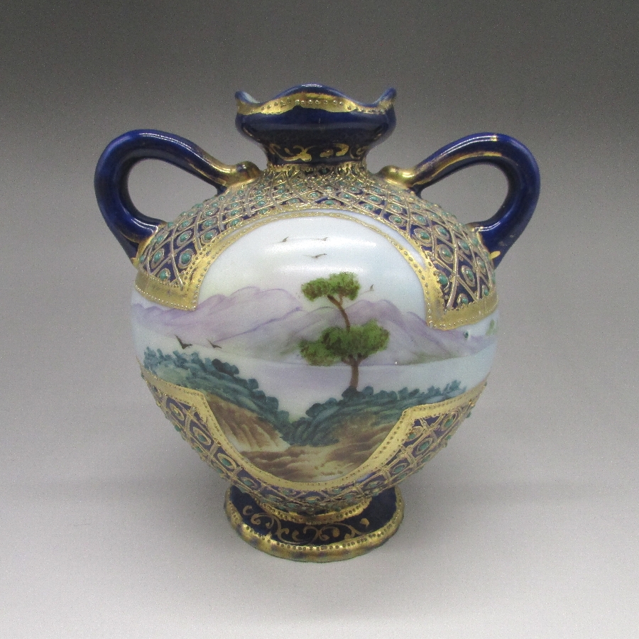 オールドノリタケのコバルトジュール風景文花瓶です。1891年頃~1915年頃にアメリカに輸出され、約100年の時を経て日本に里帰りしてきました。オールドノリタケは現在のノリタケカンパニーが明治末期から戦前までに製造したアンティーク陶磁器の総称です。豪華絢爛な西洋風絵付け陶磁器は海外で人気を博しました。近年では、約100年という長い歳月を経て日本に里帰りしてきたことで、わが国でも大変人気が高くなっており、美術工芸品として高い地位を確保しつつあります。