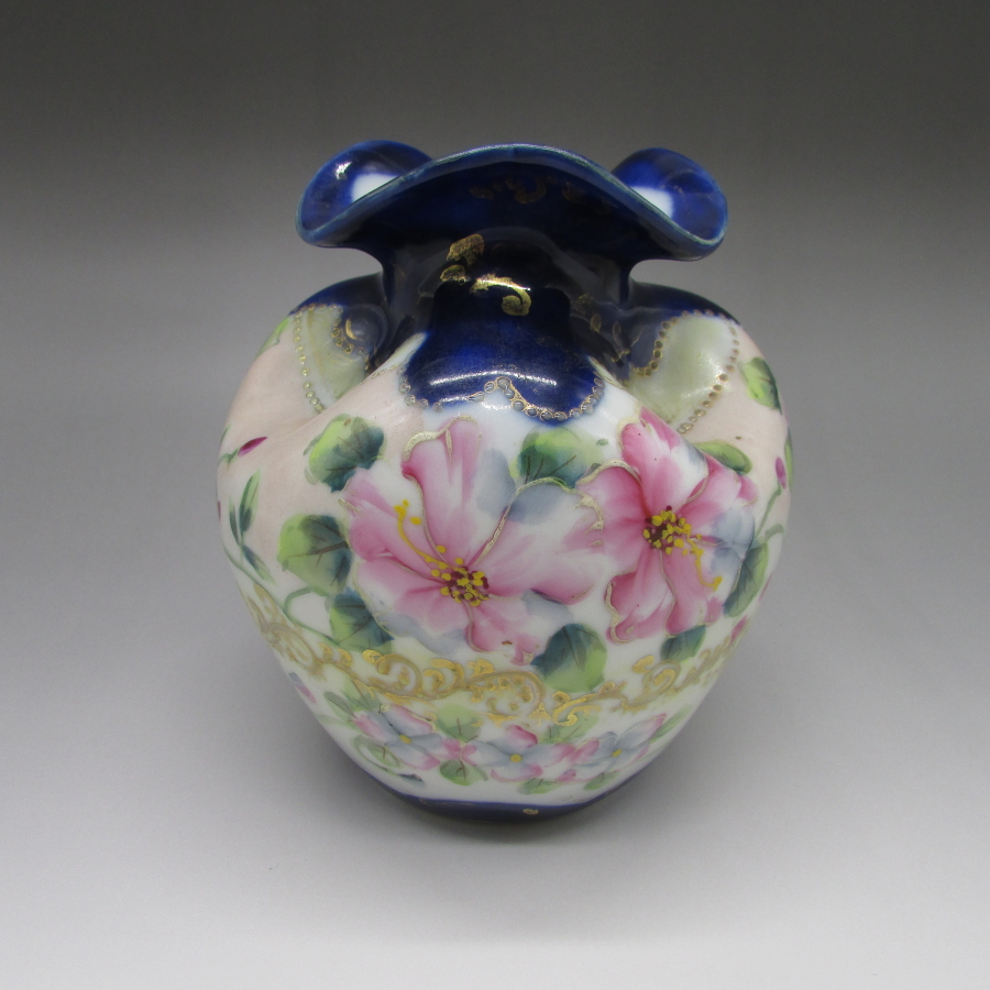 オールドノリタケのコバルト草花文花瓶です。1891年頃~1915年頃にアメリカに輸出され、約100年の時を経て日本に里帰りしてきました。オールドノリタケは現在のノリタケカンパニーが明治末期から戦前までに製造したアンティーク陶磁器の総称です。豪華絢爛な西洋風絵付け陶磁器は海外で人気を博しました。近年では、約100年という長い歳月を経て日本に里帰りしてきたことで、わが国でも大変人気が高くなっており、美術工芸品として高い地位を確保しつつあります。
