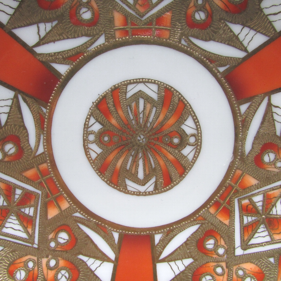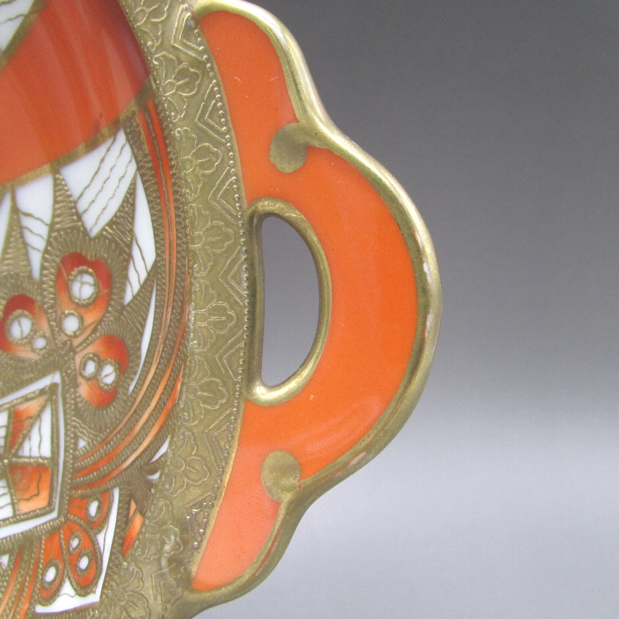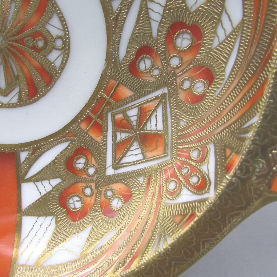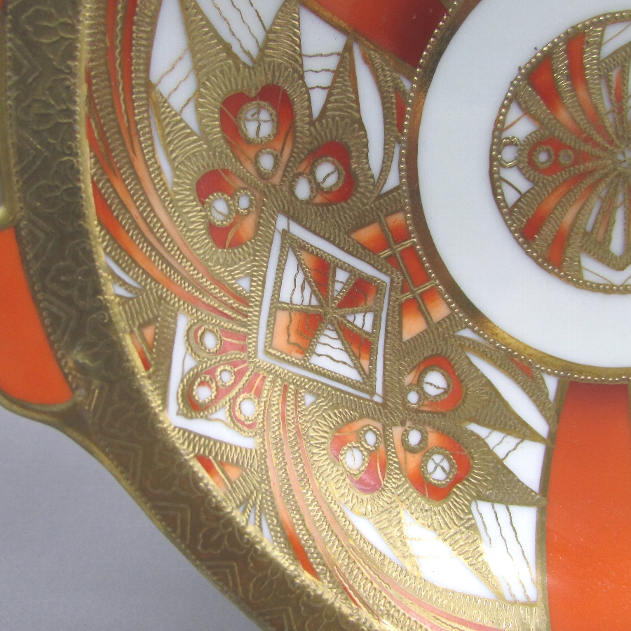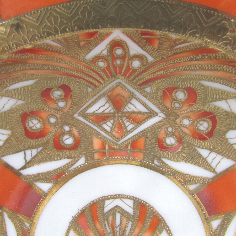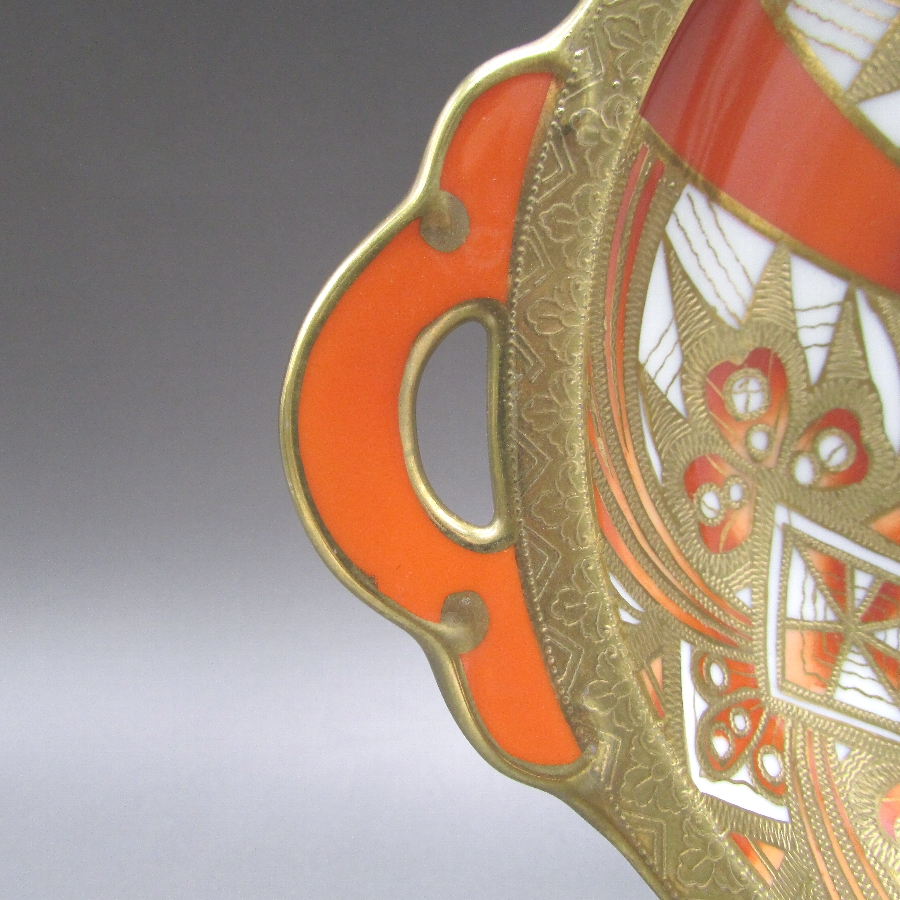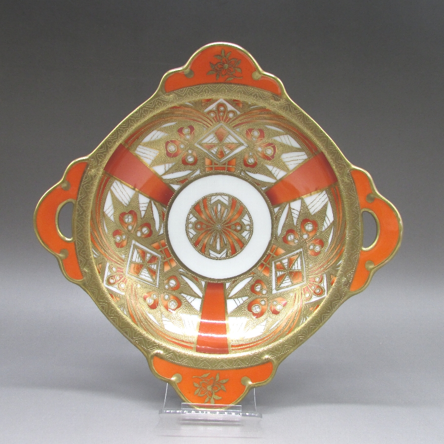 オールドノリタケのジオメトリックボウルです。1911年頃~1941年頃にイギリスに輸出され、約100年の時を経て日本に里帰りしてきました。オールドノリタケは現在のノリタケカンパニーが明治末期から戦前までに製造したアンティーク陶磁器の総称です。豪華絢爛な西洋風絵付け陶磁器は海外で人気を博しました。近年では、約100年という長い歳月を経て日本に里帰りしてきたことで、わが国でも大変人気が高くなっており、美術工芸品として高い地位を確保しつつあります。