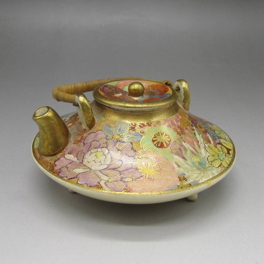 薩摩焼(銘:越田)が海外向けに作陶した菊花文酒器です。薩摩焼は明治時代に欧米で「極東の宝石」と評され、日本の陶磁器の人気に火を付けました。陶磁器を有望な輸出品として認識した政府は、様々な政策を講じて輸出の後押しをした結果、日本各地で作陶され様々な発展を遂げていきました。