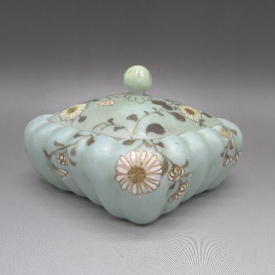 田代商店が主に欧米諸国向けに作陶した花文トリンケットボックスです。田代商店とはセント・ルイス万博の銀賞受賞社です。西洋コバルト顔料の輸入商社の松村九助商店の横浜支店の営業権を田代市郎次が譲り受けて、1880年頃に生まれた会社です。その後、松村九助が名古屋の武平町に生地工場を建設し、七間町から移転することになり、その七間町に田代商店の名古屋支店を開設しています。その後、1900年のパリ万博に陶磁器を多数出品し、1904年のセント・ルイス万博博覧会では、美術の項で銀賞受賞、1910年の日英万国博覧会では陶磁器の項で金賞受賞しています。