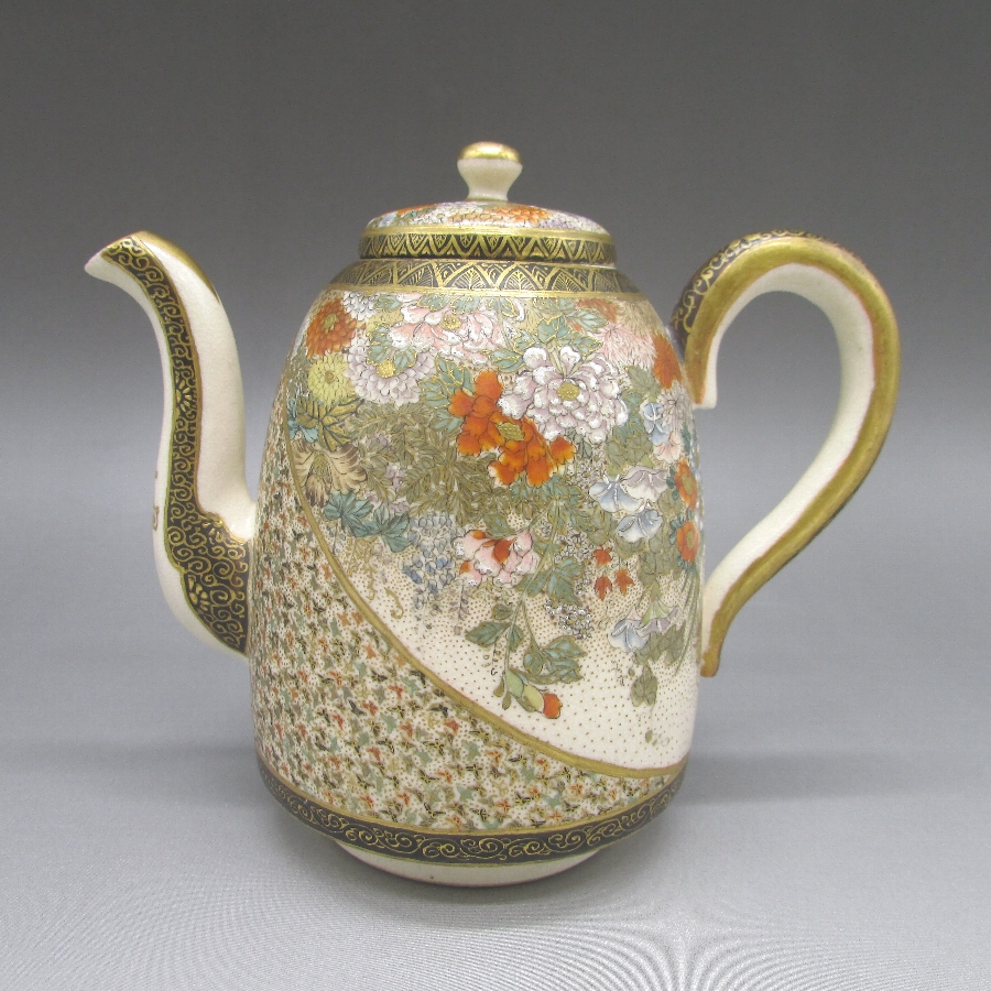 薩摩焼(銘:朝山)が海外向けに作陶した花蝶文水差です。薩摩焼は明治時代に欧米で「極東の宝石」と評され、日本の陶磁器の人気に火を付けました。陶磁器を有望な輸出品として認識した政府は、様々な政策を講じて輸出の後押しをした結果、日本各地で作陶され様々な発展を遂げていきました。
