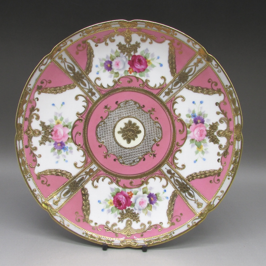 オールドノリタケの金盛り薔薇文プレートです。1911年頃~1941年頃にイギリスに輸出され、約100年の時を経て日本に里帰りしてきました。オールドノリタケは現在のノリタケカンパニーが明治末期から戦前までに製造したアンティーク陶磁器の総称です。豪華絢爛な西洋風絵付け陶磁器は海外で人気を博しました。近年では、約100年という長い歳月を経て日本に里帰りしてきたことで、わが国でも大変人気が高くなっており、美術工芸品として高い地位を確保しつつあります。