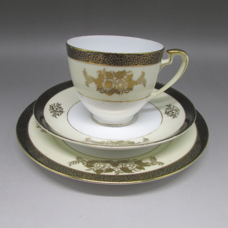 オールドノリタケの金彩唐草文トリオです。1906年頃~1925年頃にイギリスに輸出され、約100年の時を経て日本に里帰りしてきました。オールドノリタケは現在のノリタケカンパニーが明治末期から戦前までに製造したアンティーク陶磁器の総称です。豪華絢爛な西洋風絵付け陶磁器は海外で人気を博しました。近年では、約100年という長い歳月を経て日本に里帰りしてきたことで、わが国でも大変人気が高くなっており、美術工芸品として高い地位を確保しつつあります。