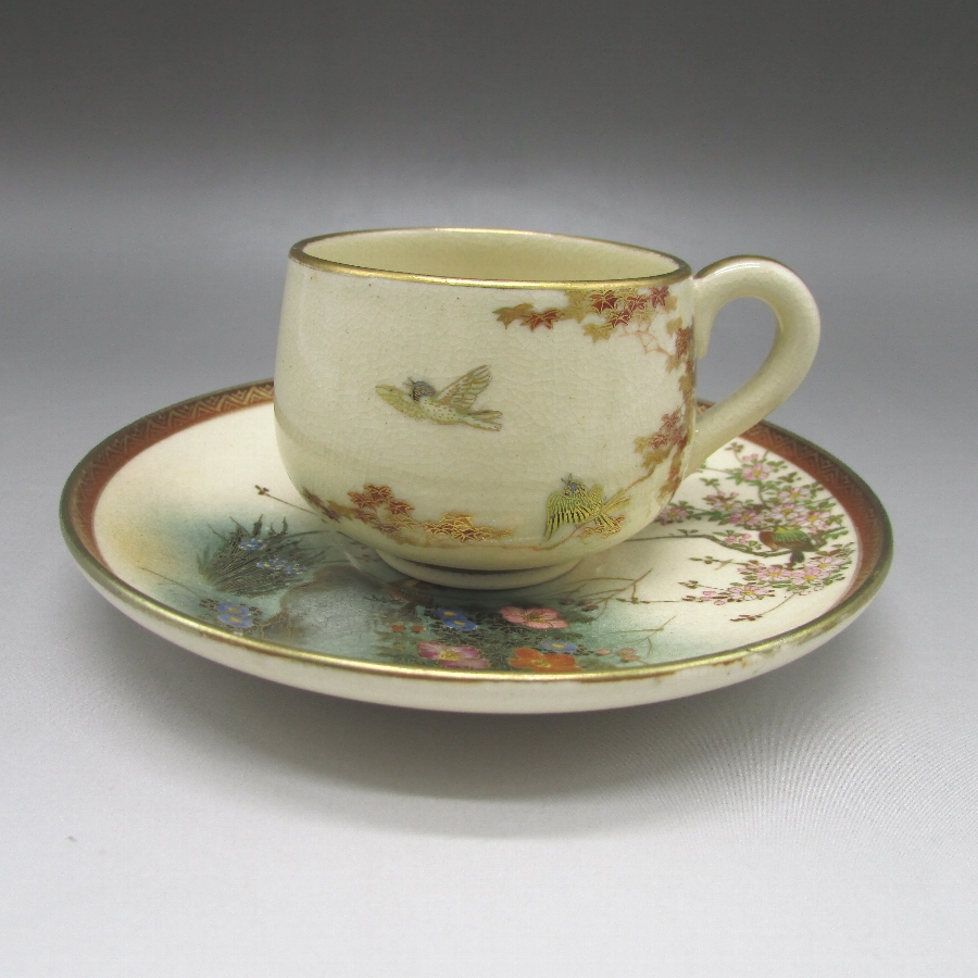 薩摩焼(銘:神山)が海外向けに作陶した花鳥文洋茶碗です。薩摩焼は明治時代に欧米で「極東の宝石」と評され、日本の陶磁器の人気に火を付けました。陶磁器を有望な輸出品として認識した政府は、様々な政策を講じて輸出の後押しをした結果、日本各地で作陶され様々な発展を遂げていきました。