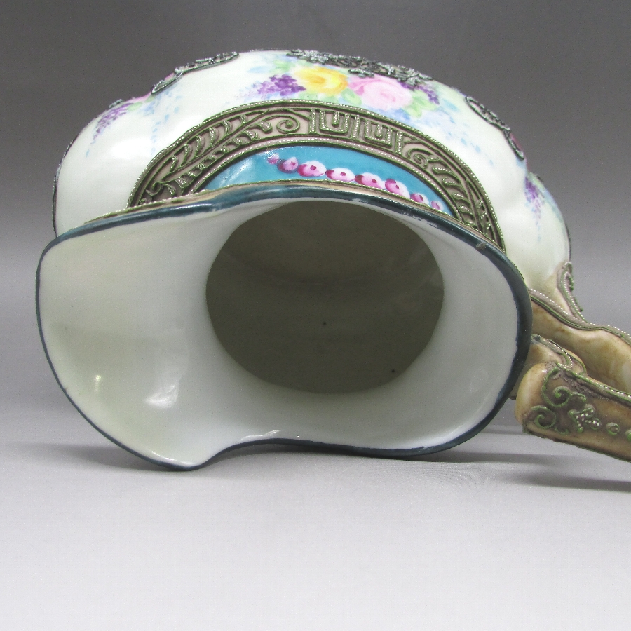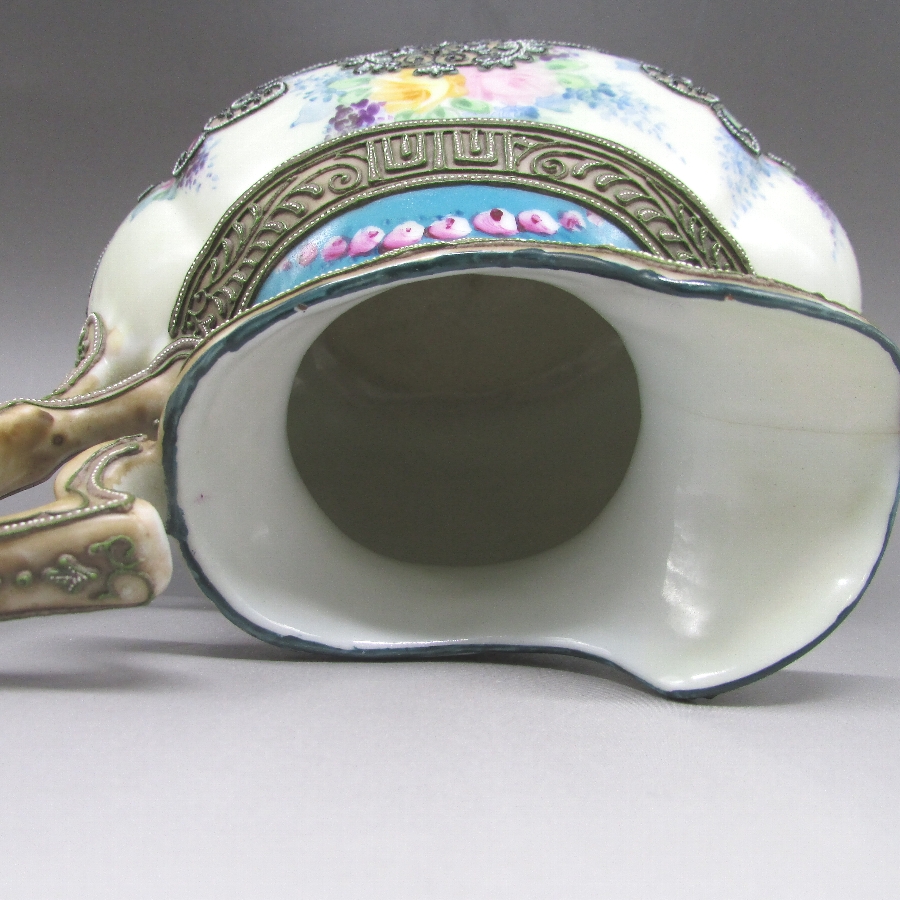 オールドノリタケの盛り上げ薔薇文水差一対です。1900年頃~1910年頃にイギリスに輸出され、約100年の時を経て日本に里帰りしてきました。アール・ヌーヴォ時代の影響を受けた薔薇が描かれた作品です。輸出陶磁器におけるデザインでは、花が最も多く、中でも薔薇が一番人気でした。薔薇は中世以来に日本の美術工芸で好まれたモティーフであった為に、絵付け職人にも馴染みがあり描きやすかったと思います。