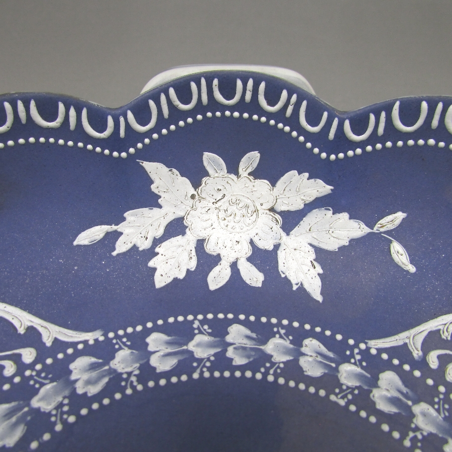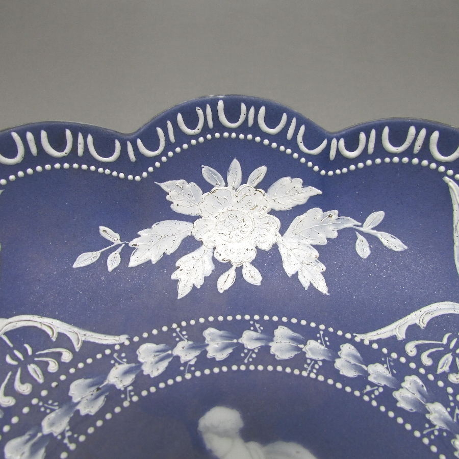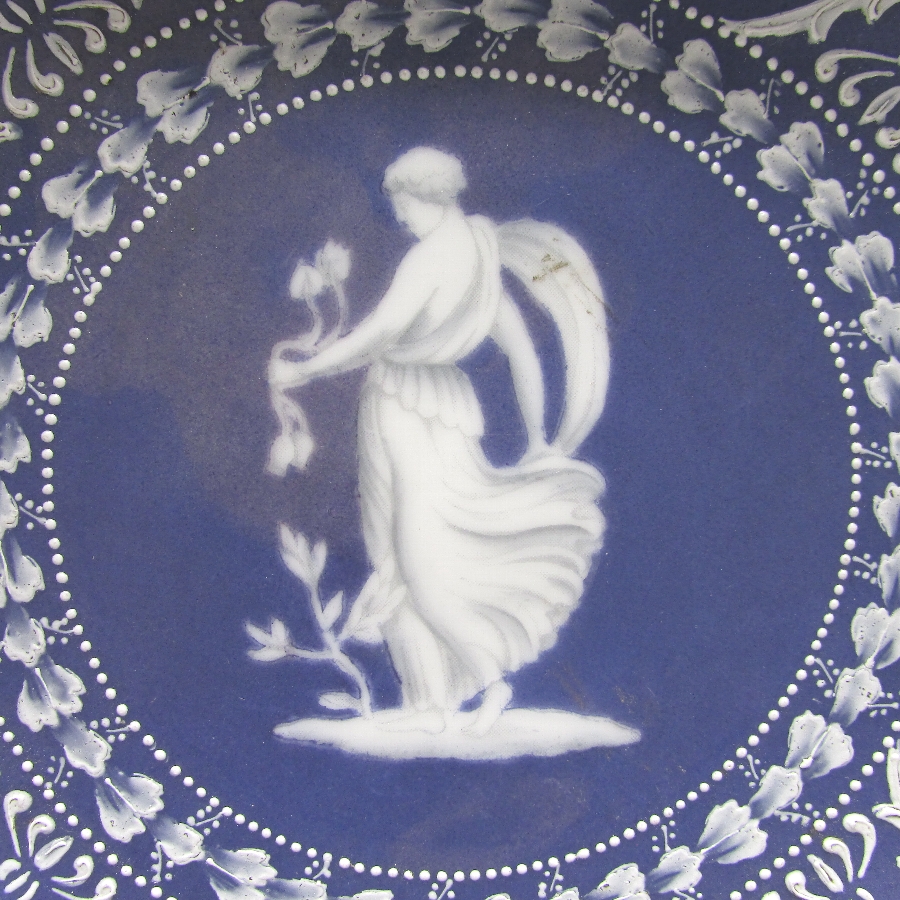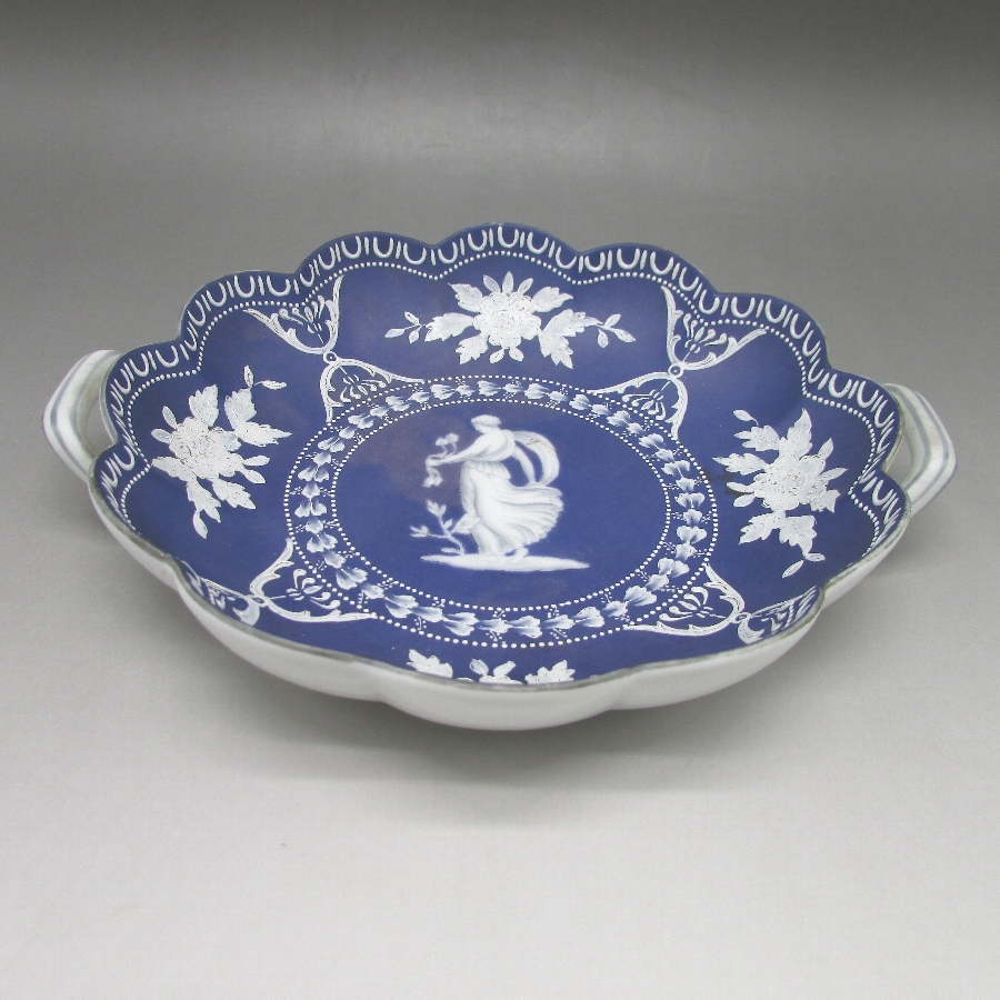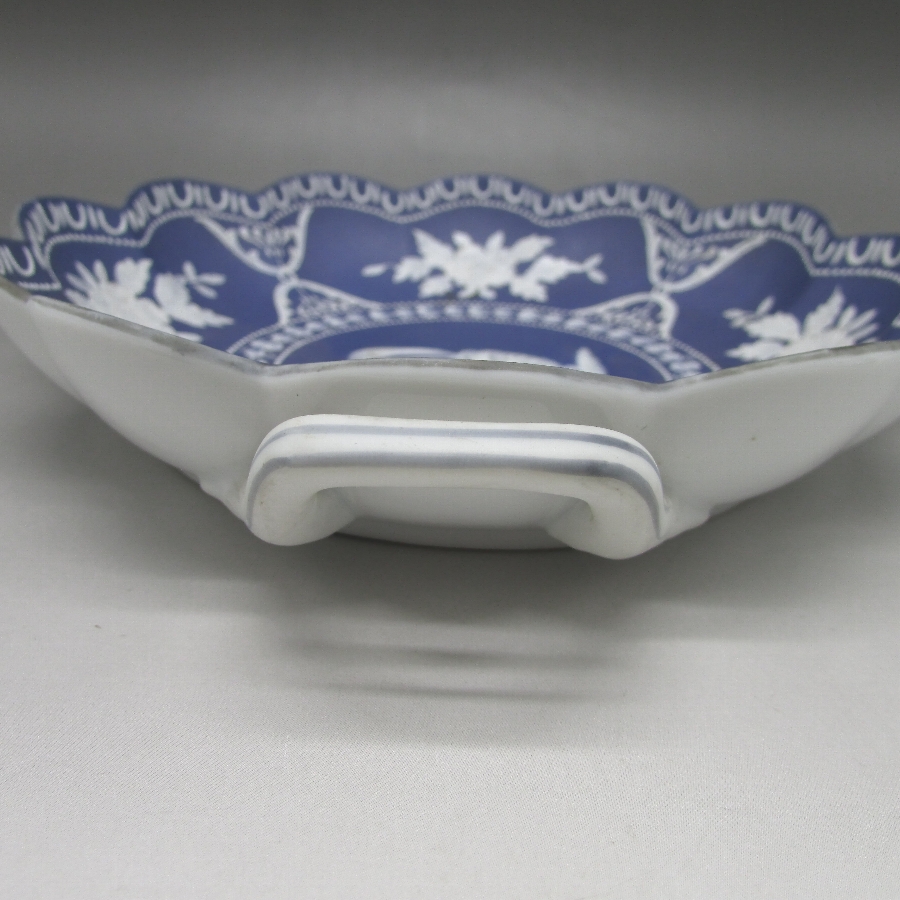 オールドノリタケのウェッジウッド風人物文ボウルです。1931年頃~1941年頃にアメリカに輸出され、約100年の時を経て日本に里帰りしてきました。英国のウエッジウッド社のジャスパーウェアを盛り上げ技法を用いて製造した作品です。ジャスパー社の貼り付け技法と異なり、白泥漿を筆などで直接絵付けする独自の方法で模倣することで緻密装飾を再現している点が非常に魅力的です。18世紀後半にマイセン窯もジャスパーウェアの模倣を製造したほど人気がありました。当時の日本の職人が試行錯誤した様子が伺えます。