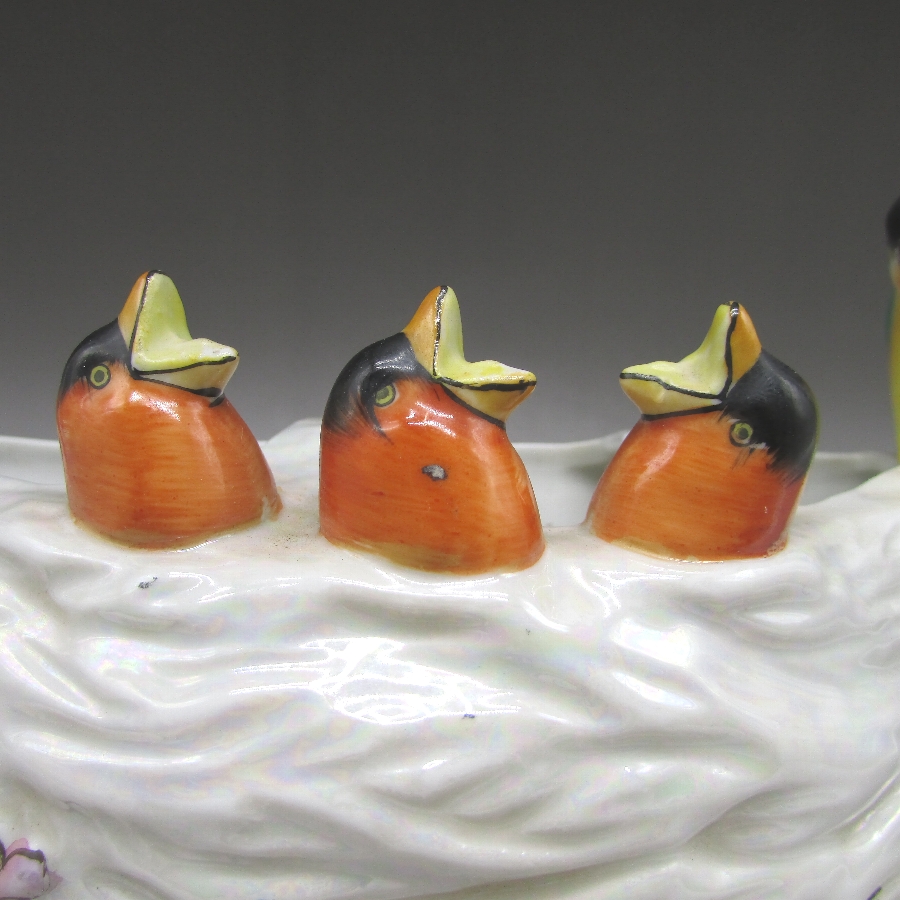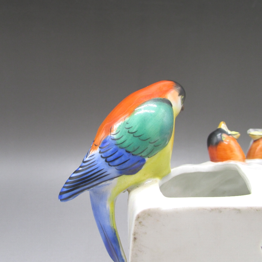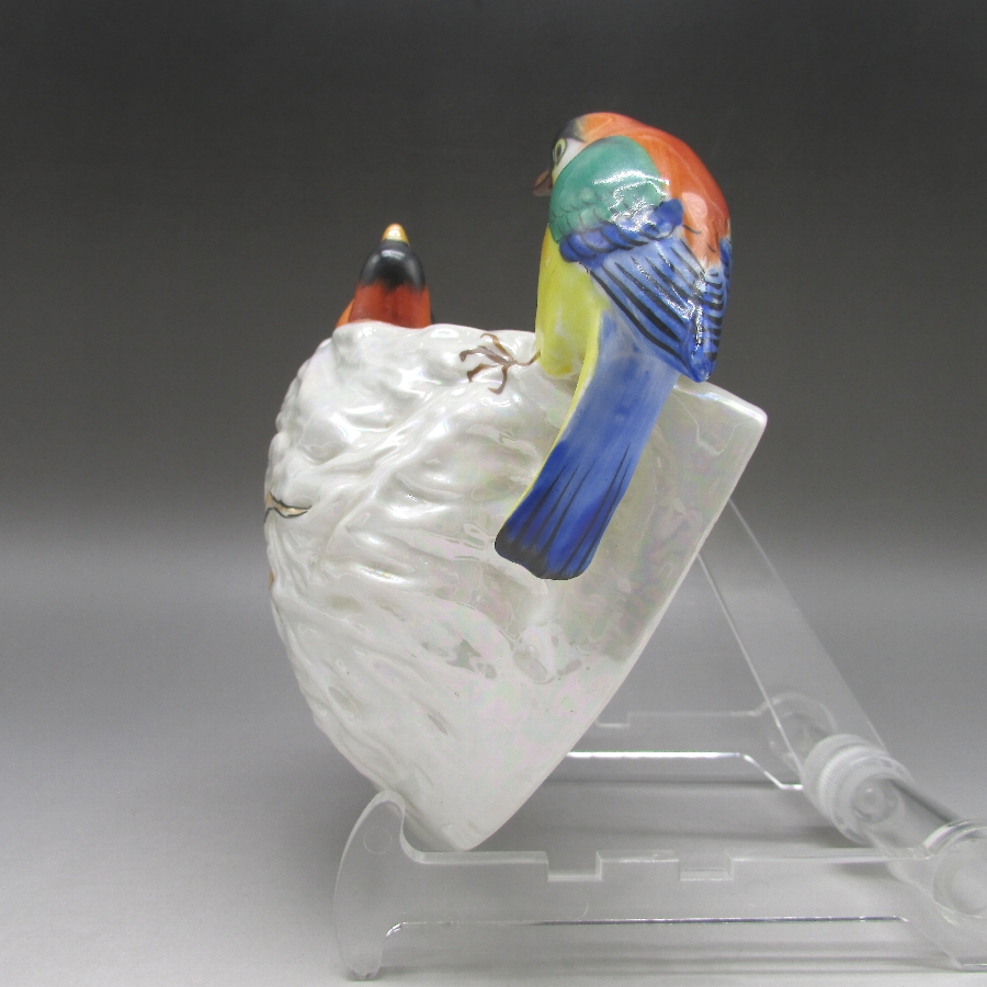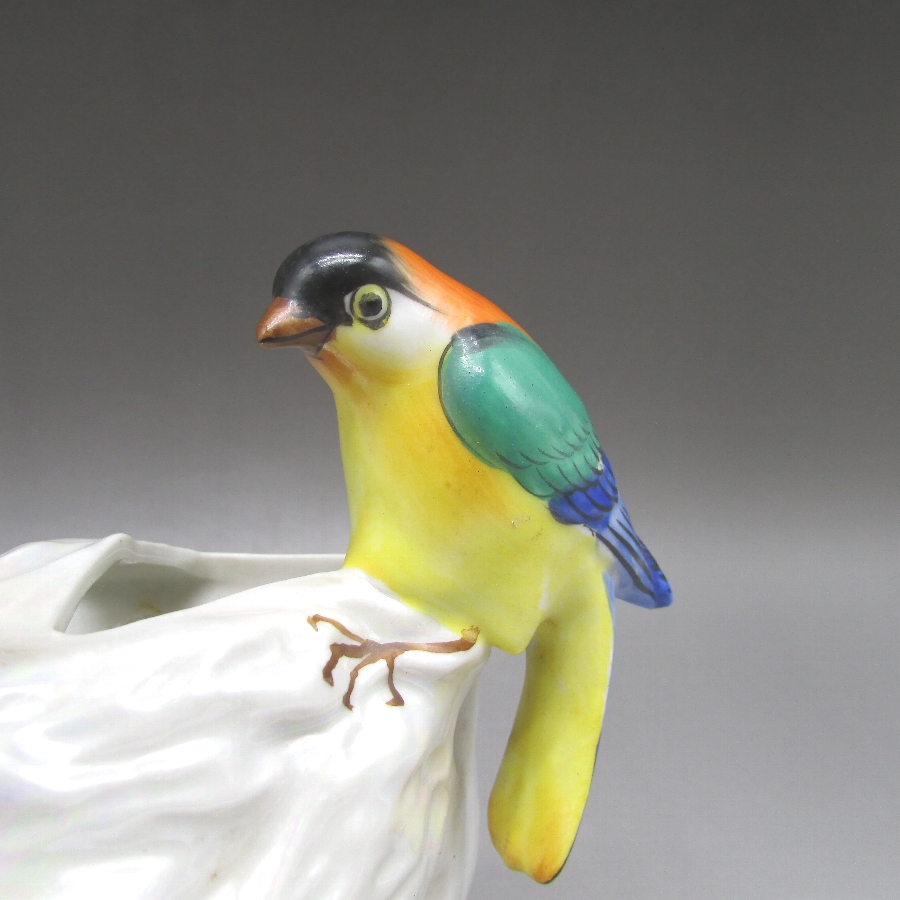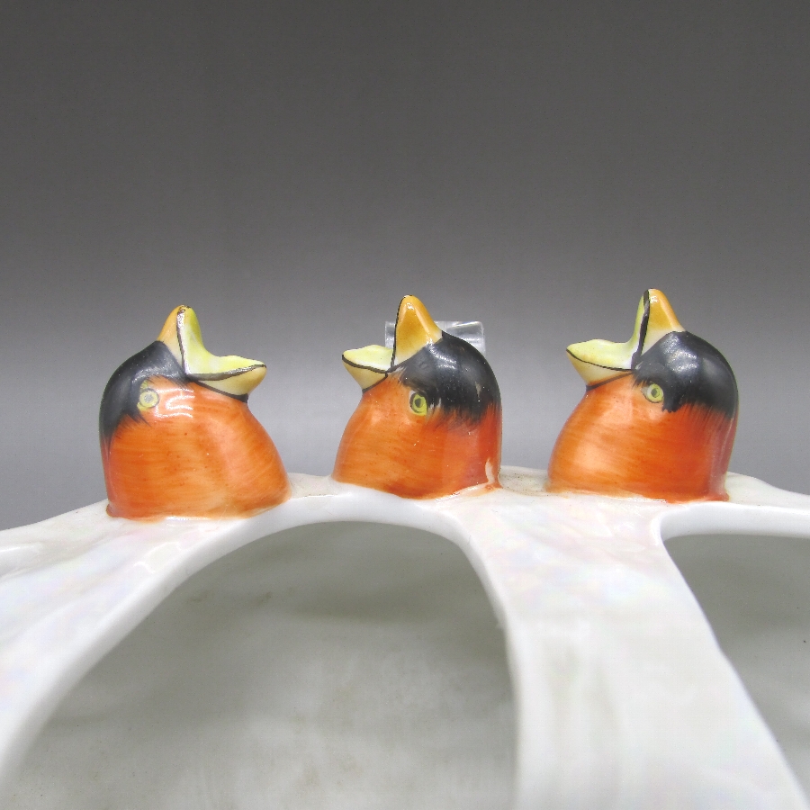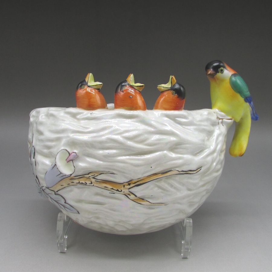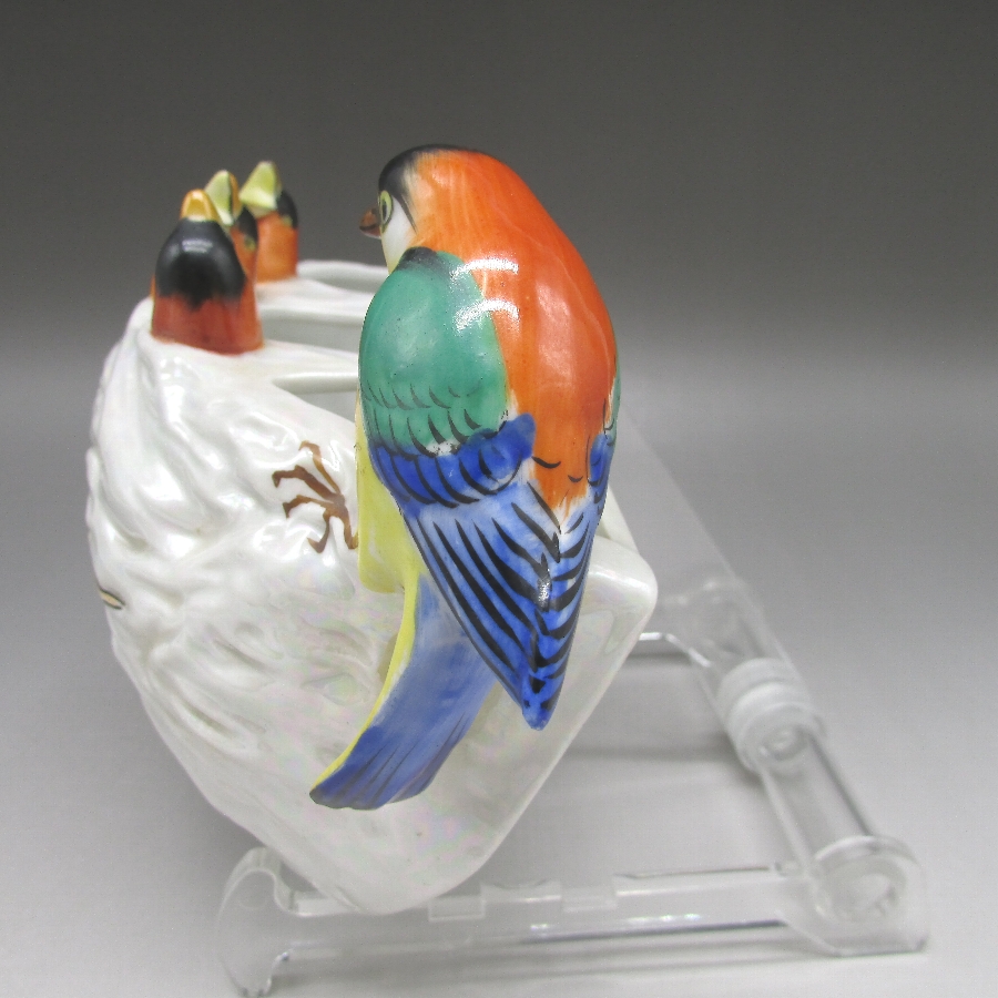オールドノリタケの親子鳥フィギュア付ウォールポケットです。1921年頃~1941年頃にアメリカに輸出され、約100年の時を経て日本に里帰りしてきました。オールドノリタケは現在のノリタケカンパニーが明治末期から戦前までに製造したアンティーク陶磁器の総称です。豪華絢爛な西洋風絵付け陶磁器は海外で人気を博しました。近年では、約100年という長い歳月を経て日本に里帰りしてきたことで、わが国でも大変人気が高くなっており、美術工芸品として高い地位を確保しつつあります。