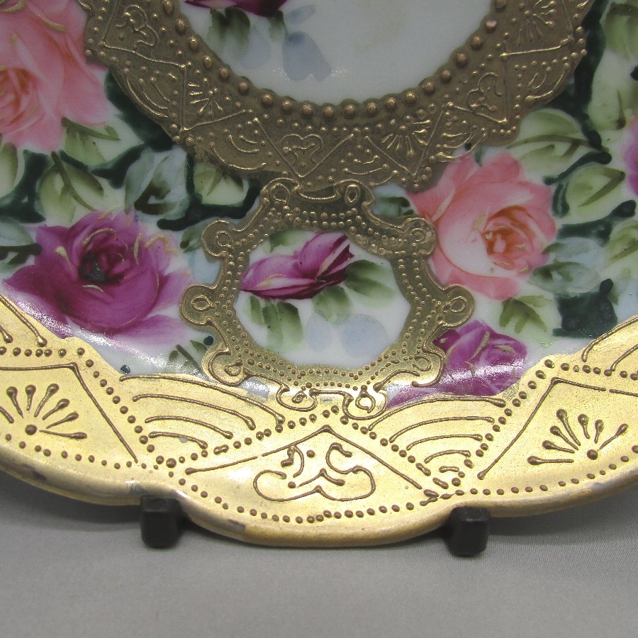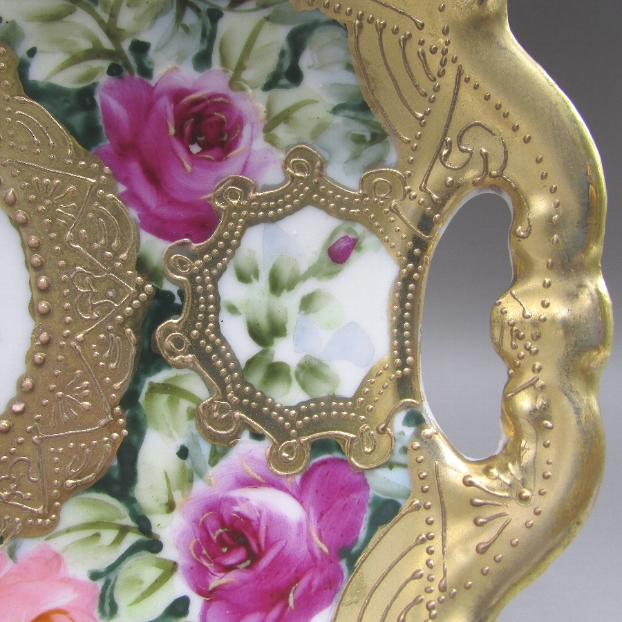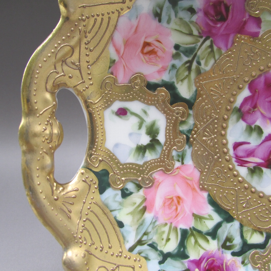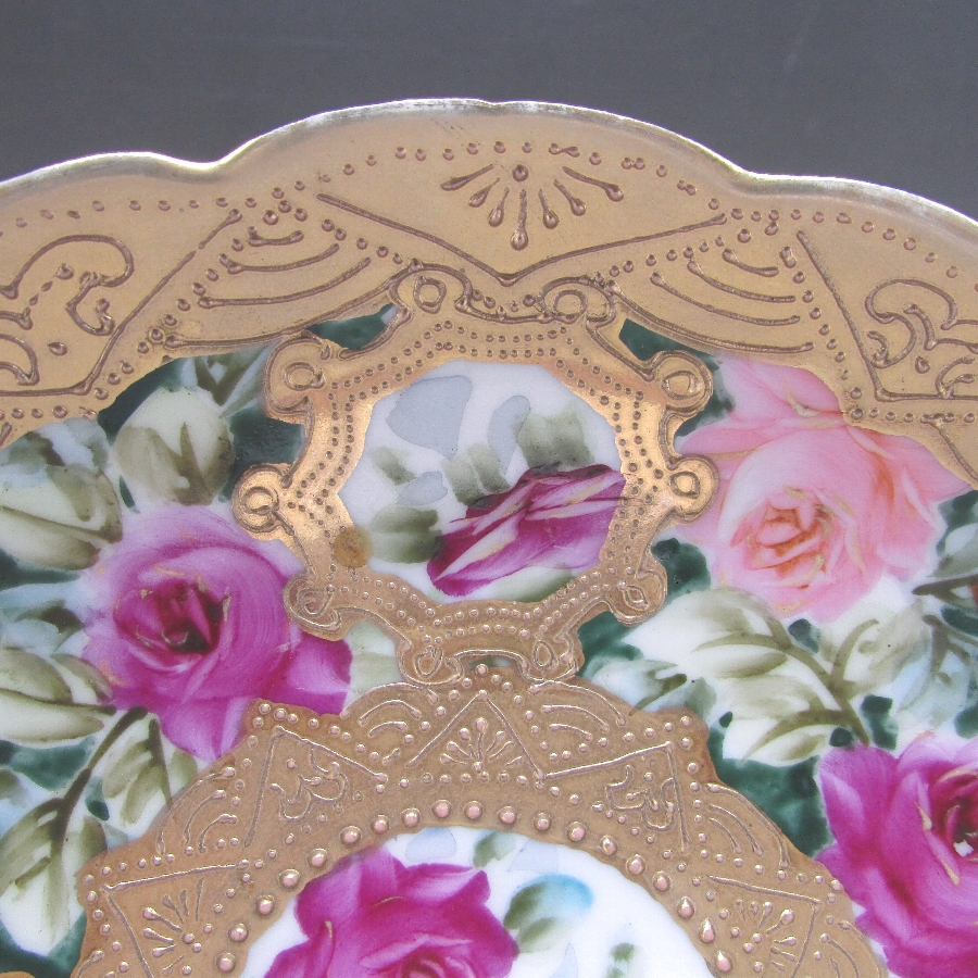 オールドノリタケの金盛り薔薇文ケーキプレートです。1891年頃~1915年頃にアメリカに輸出され、約100年の時を経て日本に里帰りしてきました。アール・ヌーヴォ時代の影響を受けた薔薇を描き、周囲に金盛り装飾を添えた素晴らしい作品です。輸出陶磁器におけるデザインでは、花が最も多く、中でも薔薇が一番人気でした。薔薇は中世以来に日本の美術工芸で好まれたモティーフであった為に、絵付け職人にも馴染みがあり描きやすかったと思います。金盛り装飾は高級品の代表的な装飾技法で、点、点線、線などを泥漿で描き、焼成した後に金液を筆などで塗り被せて仕上げる技法です。欧米で人気のあった豪華絢爛な仕上がりにするのに最適な技法です。オールドノリタケでよく用いられている金液は金の延棒を濃塩酸と濃硝酸を体積比で3対1に混ぜた溶液で溶解し液状にしたものを使用していました。
