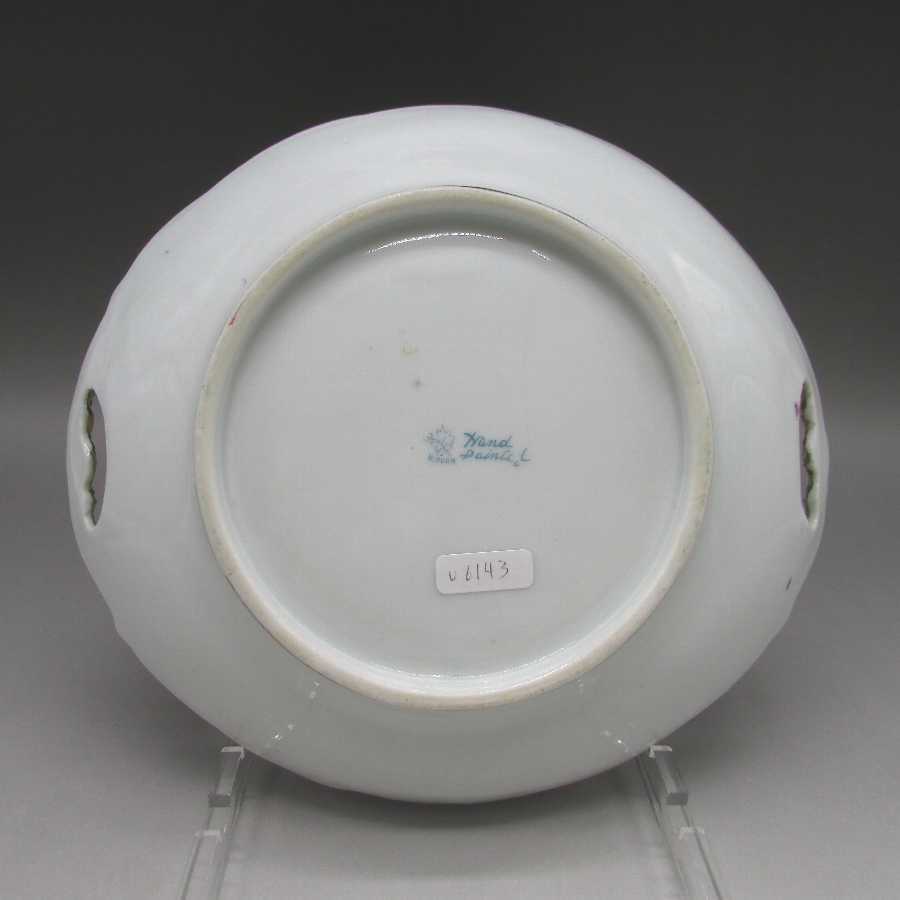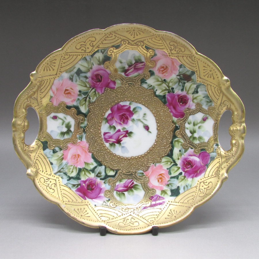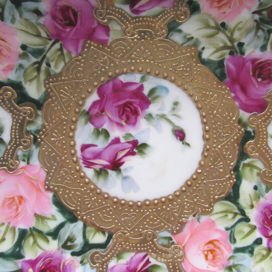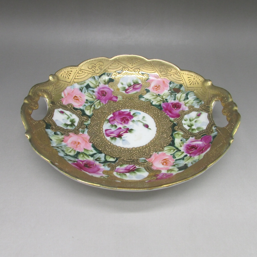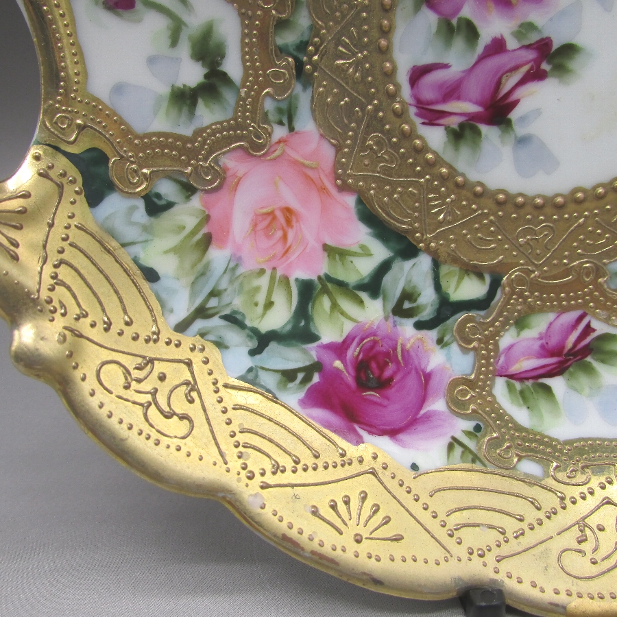 オールドノリタケの金盛り薔薇文ケーキプレートです。1891年頃~1915年頃にアメリカに輸出され、約100年の時を経て日本に里帰りしてきました。アール・ヌーヴォ時代の影響を受けた薔薇を描き、周囲に金盛り装飾を添えた素晴らしい作品です。輸出陶磁器におけるデザインでは、花が最も多く、中でも薔薇が一番人気でした。薔薇は中世以来に日本の美術工芸で好まれたモティーフであった為に、絵付け職人にも馴染みがあり描きやすかったと思います。金盛り装飾は高級品の代表的な装飾技法で、点、点線、線などを泥漿で描き、焼成した後に金液を筆などで塗り被せて仕上げる技法です。欧米で人気のあった豪華絢爛な仕上がりにするのに最適な技法です。オールドノリタケでよく用いられている金液は金の延棒を濃塩酸と濃硝酸を体積比で3対1に混ぜた溶液で溶解し液状にしたものを使用していました。