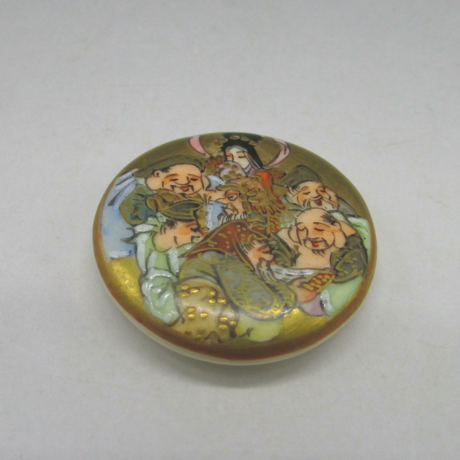 薩摩焼(銘:無銘)が海外向けに作陶した七福神文ボタンです。薩摩焼は明治時代に欧米で「極東の宝石」と評され、日本の陶磁器の人気に火を付けました。陶磁器を有望な輸出品として認識した政府は、様々な政策を講じて輸出の後押しをした結果、日本各地で作陶され様々な発展を遂げていきました。