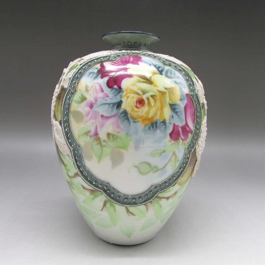 オールドノリタケのベリー盛り上げ薔薇文花瓶です。1891年頃~1915年頃にアメリカに輸出され、約100年の時を経て日本に里帰りしてきました。オールドノリタケは現在のノリタケカンパニーが明治末期から戦前までに製造したアンティーク陶磁器の総称です。豪華絢爛な西洋風絵付け陶磁器は海外で人気を博しました。近年では、約100年という長い歳月を経て日本に里帰りしてきたことで、わが国でも大変人気が高くなっており、美術工芸品として高い地位を確保しつつあります。