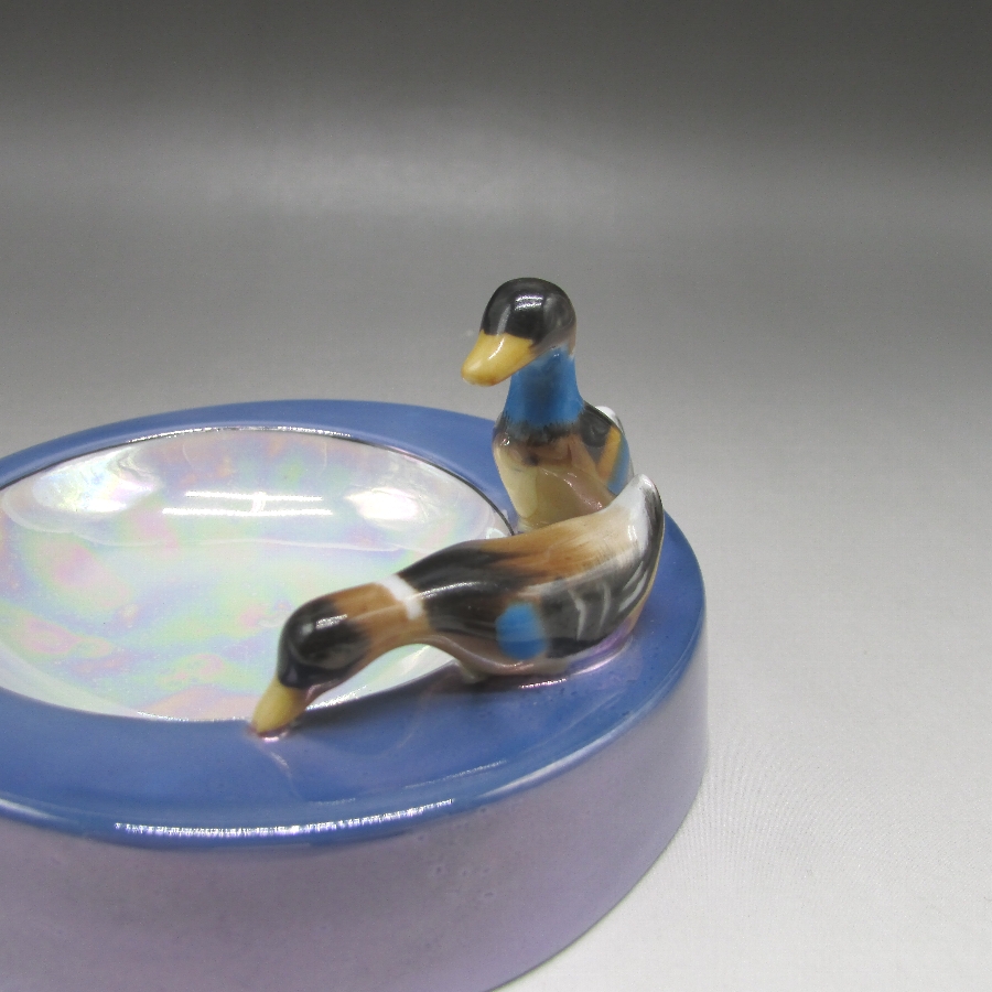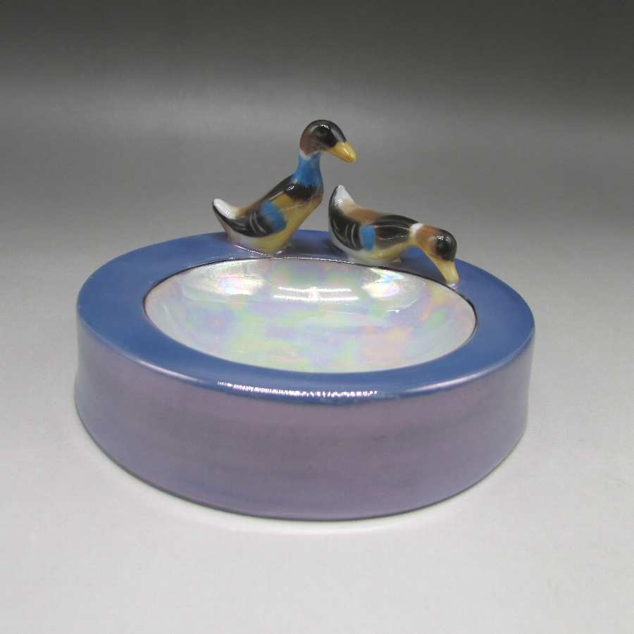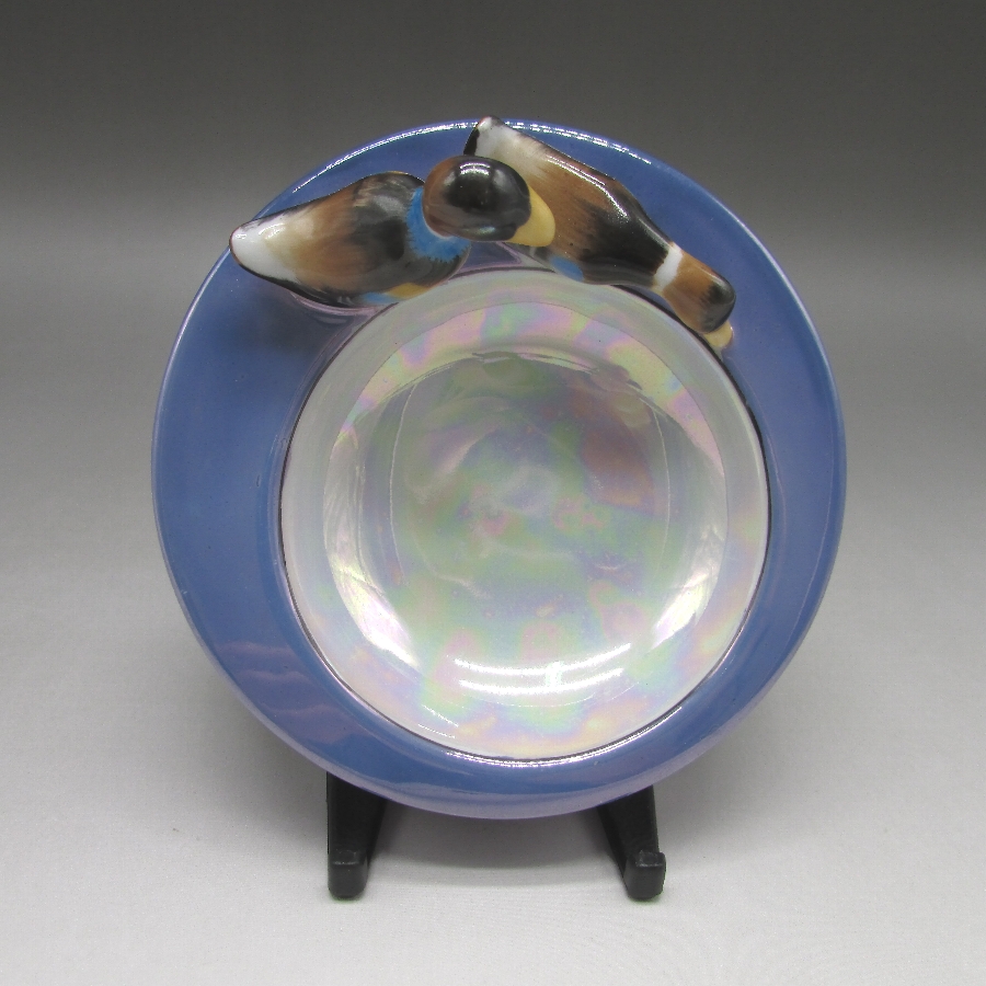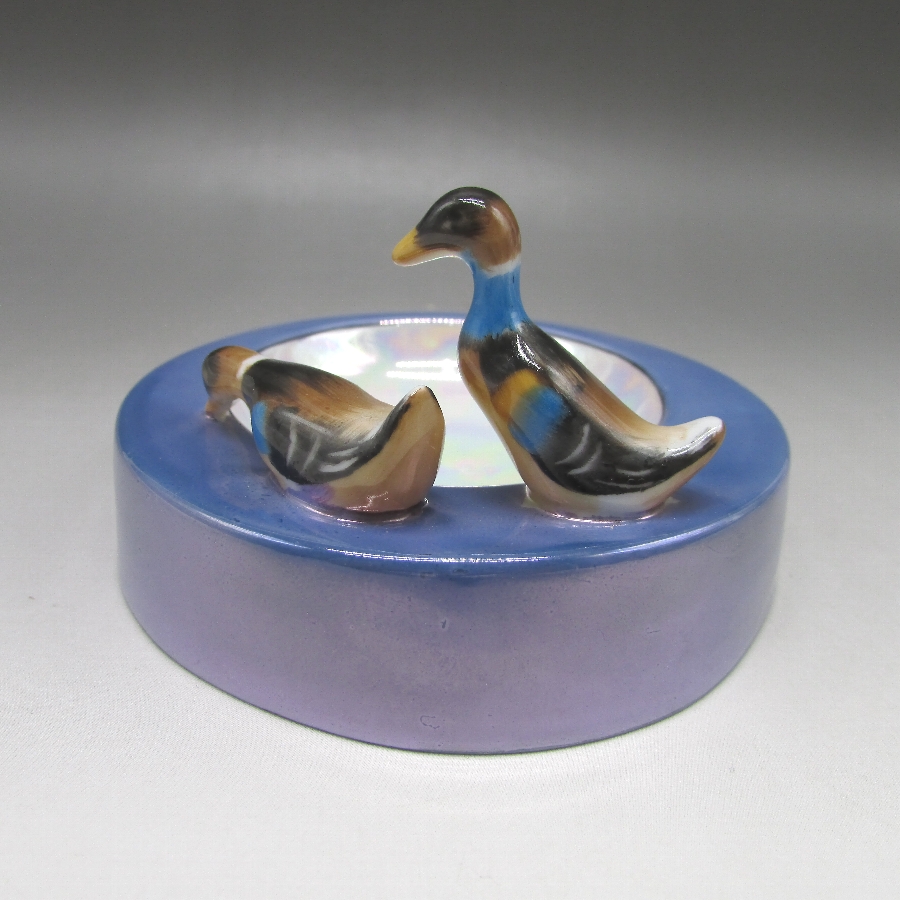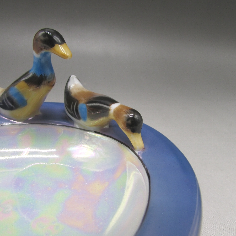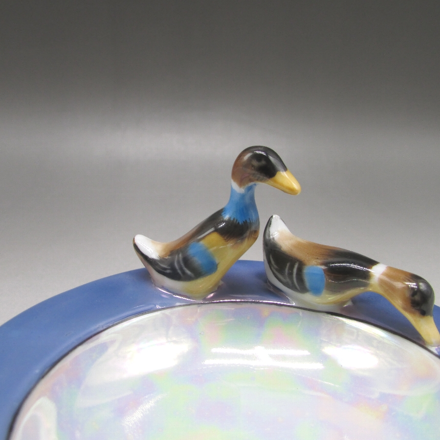 オールドノリタケの鳥フィギュア付ピンディッシュです。1911年頃~1941年頃にイギリスに輸出され、約100年の時を経て日本に里帰りしてきました。親子の鴨でしょうか?仲良く散歩をしているワンシーンをピンディッシュに合わせたアールデコ期の素敵な作品です。フィギュア付きのアイテムはオールドノリタケのコレクターの間でとても人気があります。その中でも特に人気の高いものが鳥のフィギュアが付いたもので、フィギュラルバード(FIGURAL