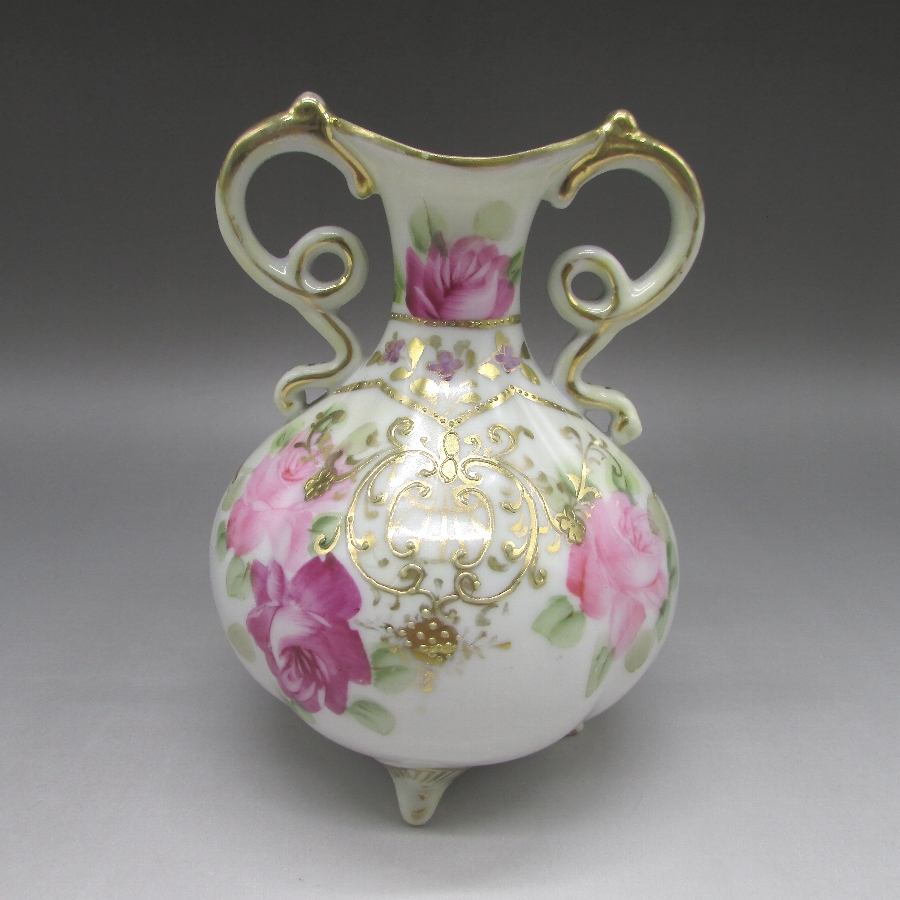 オールドノリタケの薔薇文花瓶です。1891年頃~1915年頃にアメリカに輸出され、約100年の時を経て日本に里帰りしてきました。オールドノリタケは現在のノリタケカンパニーが明治末期から戦前までに製造したアンティーク陶磁器の総称です。豪華絢爛な西洋風絵付け陶磁器は海外で人気を博しました。近年では、約100年という長い歳月を経て日本に里帰りしてきたことで、わが国でも大変人気が高くなっており、美術工芸品として高い地位を確保しつつあります。