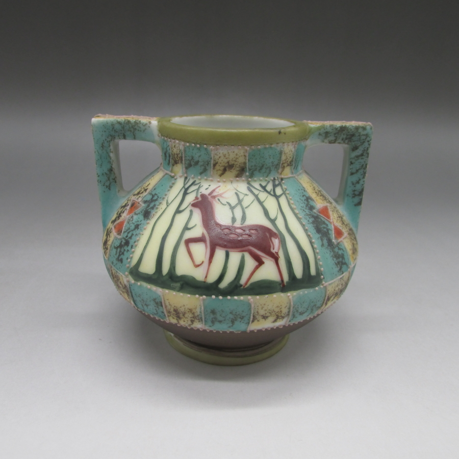 オールドノリタケの鹿文花瓶です。1911年頃~1921年頃にアメリカに輸出され、約100年の時を経て日本に里帰りしてきました。オールドノリタケは現在のノリタケカンパニーが明治末期から戦前までに製造したアンティーク陶磁器の総称です。豪華絢爛な西洋風絵付け陶磁器は海外で人気を博しました。近年では、約100年という長い歳月を経て日本に里帰りしてきたことで、わが国でも大変人気が高くなっており、美術工芸品として高い地位を確保しつつあります。