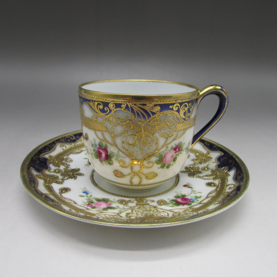 オールドノリタケの薔薇文カップ&ソーサーです。1906年頃~1925年頃にイギリスに輸出され、約100年の時を経て日本に里帰りしてきました。オールドノリタケは現在のノリタケカンパニーが明治末期から戦前までに製造したアンティーク陶磁器の総称です。豪華絢爛な西洋風絵付け陶磁器は海外で人気を博しました。近年では、約100年という長い歳月を経て日本に里帰りしてきたことで、わが国でも大変人気が高くなっており、美術工芸品として高い地位を確保しつつあります。
