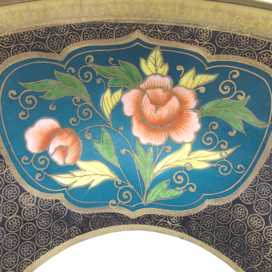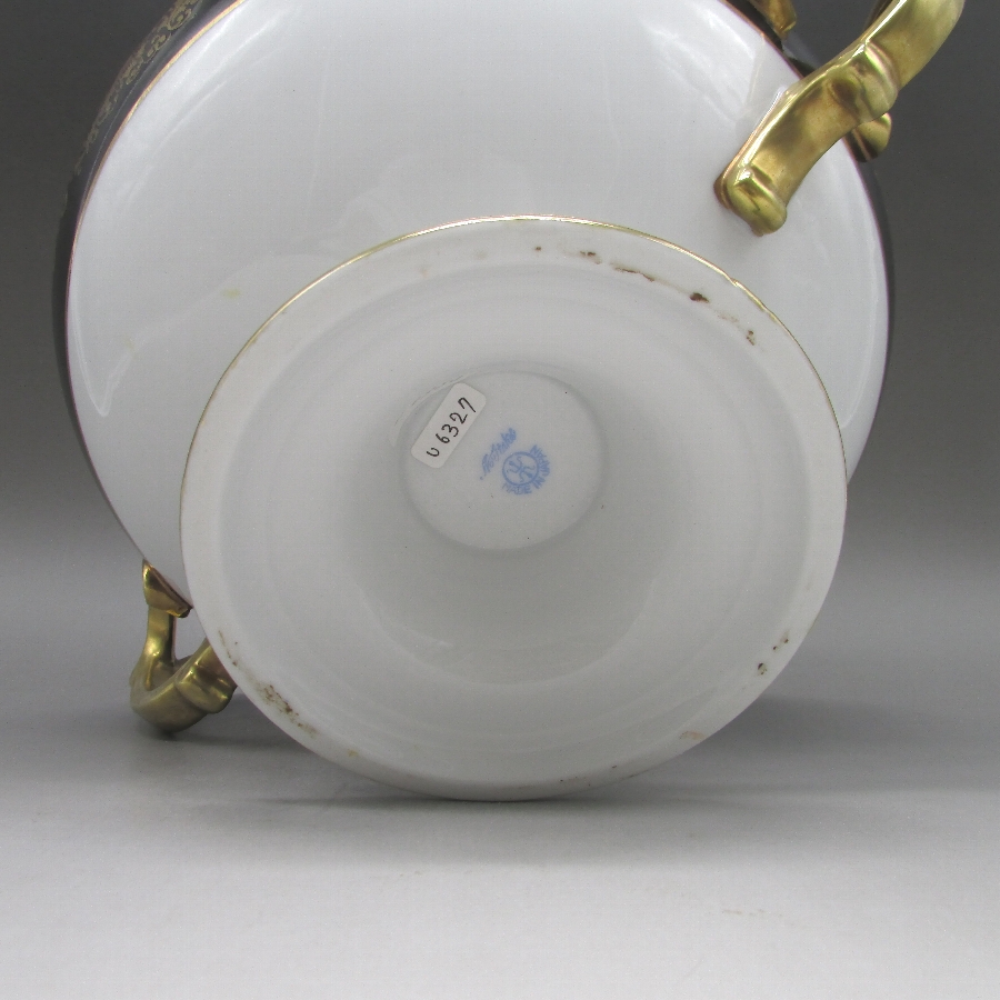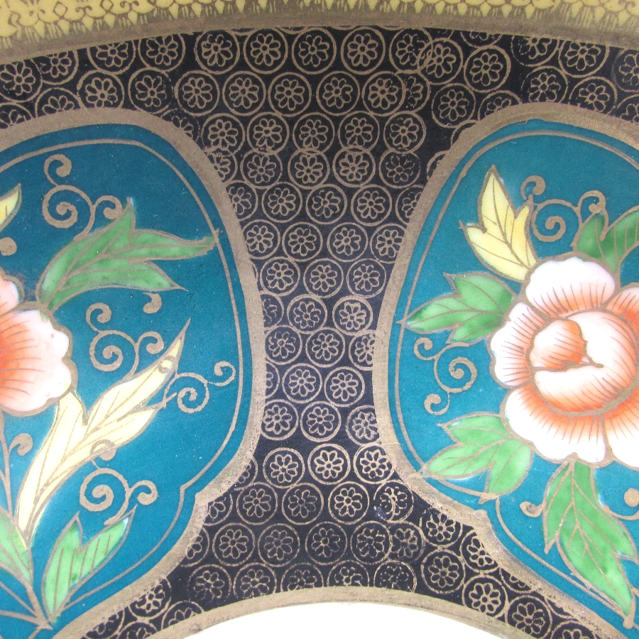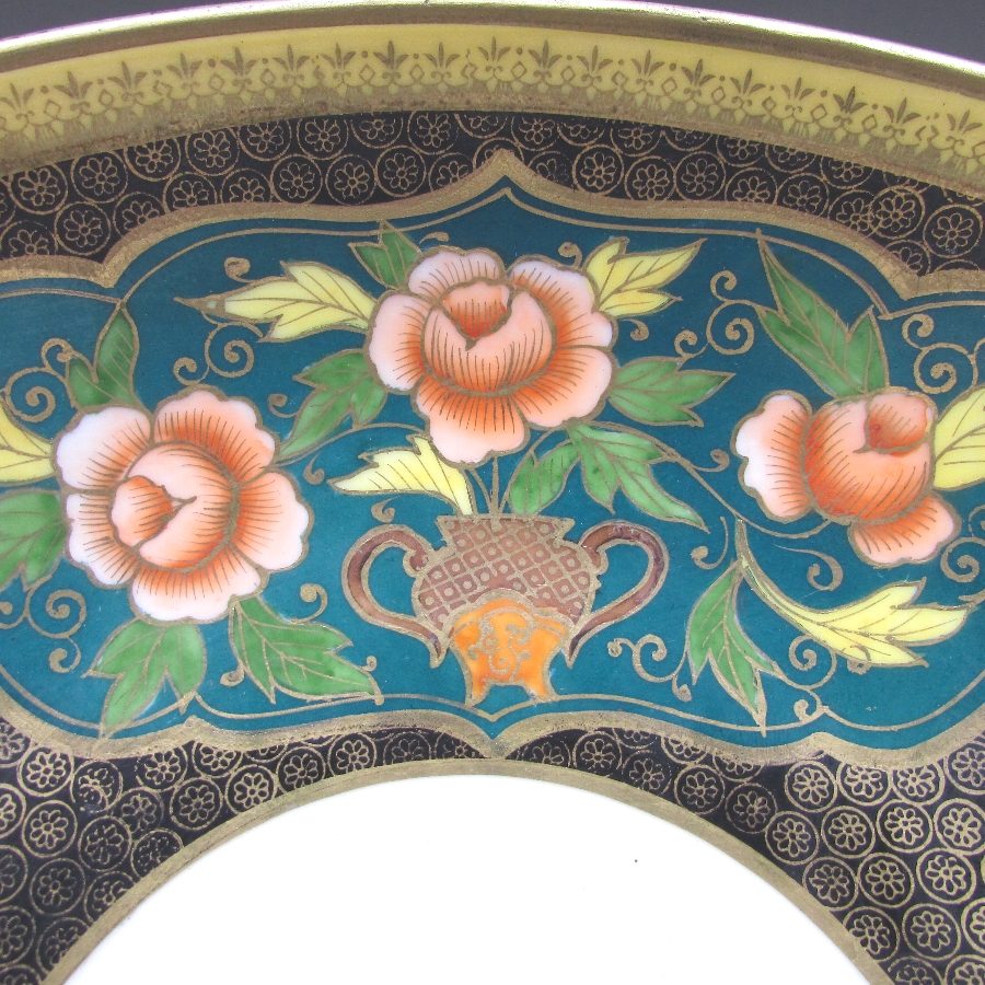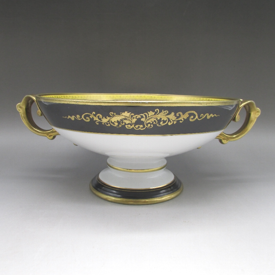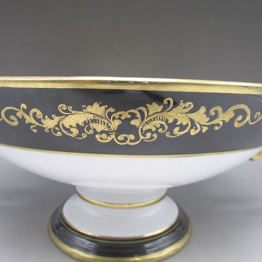 オールドノリタケの草花文コンポートです。1906年頃~1925年頃にイギリスに輸出され、約100年の時を経て日本に里帰りしてきました。黒地に金彩で細密な花文様を描いた職人の技量の高さが伺える作品です。