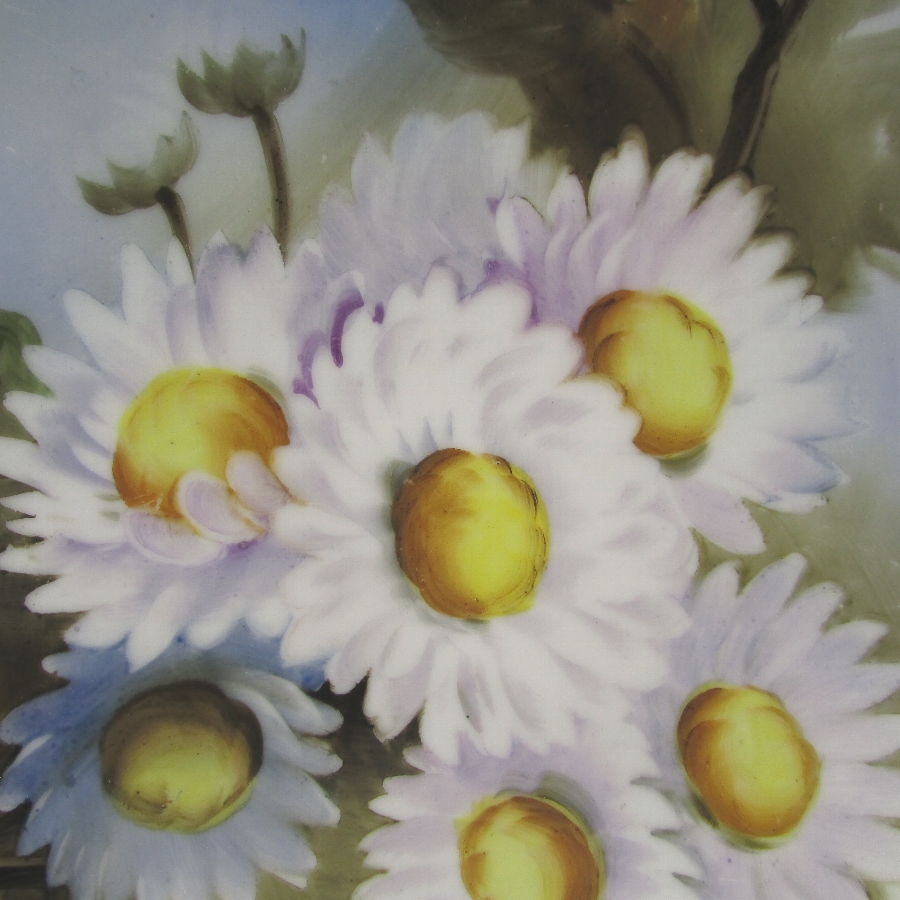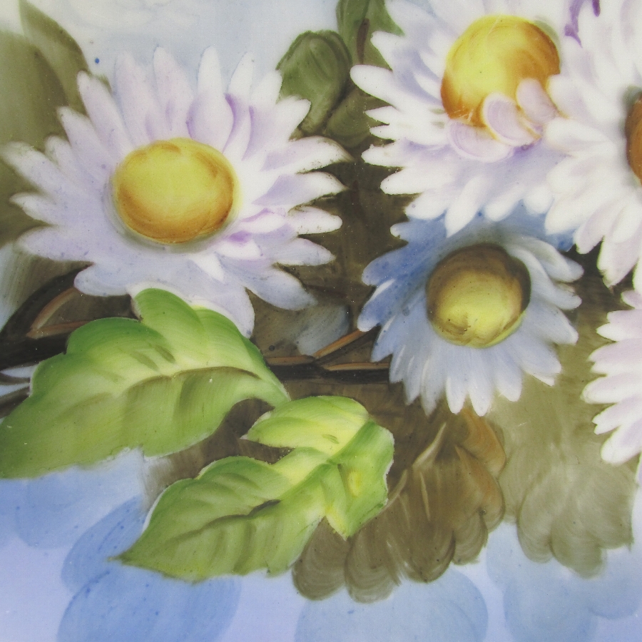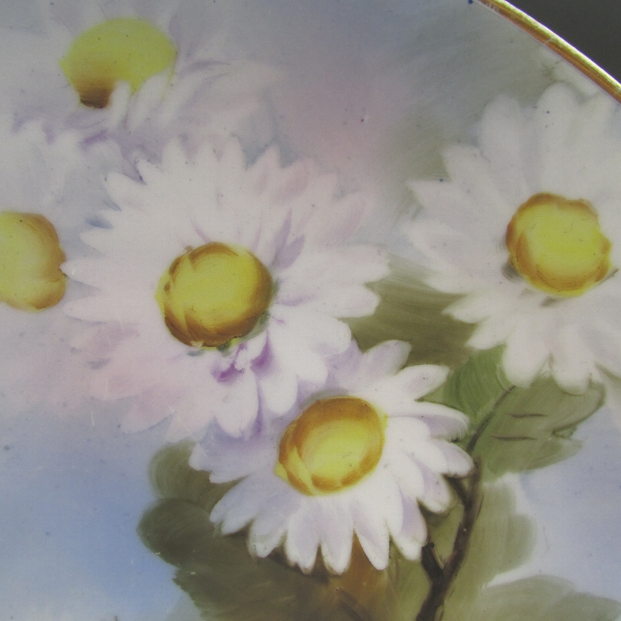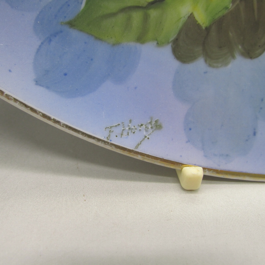 オールドノリタケのF.Hondaサイン入花文プレートです。1921年頃~1941年頃にアメリカに輸出され、約100年の時を経て日本に里帰りしてきました。「F.Honda」というサインが入っていますが、現在の研究では詳細がわかっていません。ただ、画工のサインの入った作品は市場相場を離れて、戦前のオールドノリタケや戦後のプレミアノリタケの中で最も芸術性・工芸性の高い作品です。日本陶器では同仁会の中の技芸科が画工の養成機関として存在しており、日本画や洋画、彫刻部門があり、その中で特に優れた画工のみが許されたものが画工サインであると考えられます。