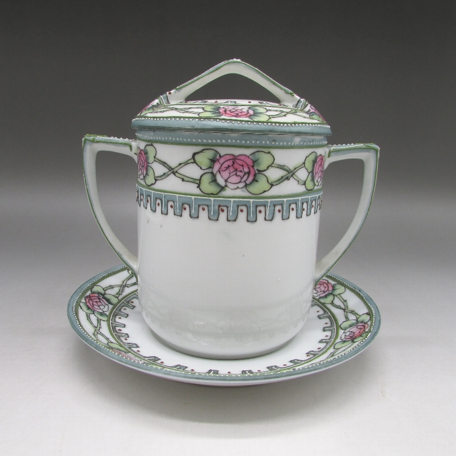 オールドノリタケの花文コンデンスミルク入れです。1911年頃~1921年頃にアメリカに輸出され、約100年の時を経て日本に里帰りしてきました。オールドノリタケは現在のノリタケカンパニーが明治末期から戦前までに製造したアンティーク陶磁器の総称です。豪華絢爛な西洋風絵付け陶磁器は海外で人気を博しました。近年では、約100年という長い歳月を経て日本に里帰りしてきたことで、わが国でも大変人気が高くなっており、美術工芸品として高い地位を確保しつつあります。